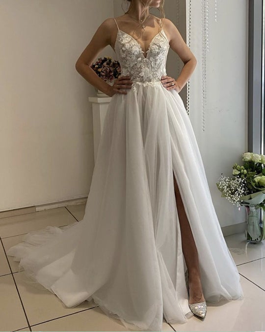 Spaghetti Straps Tulle Bridal Dresses Lace Appliques Boho Wedding Gowns Side Split Robe De Mariage