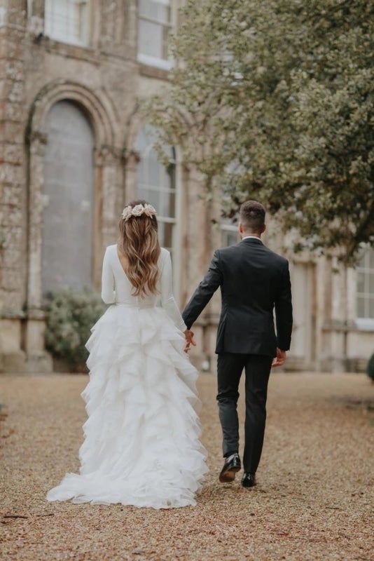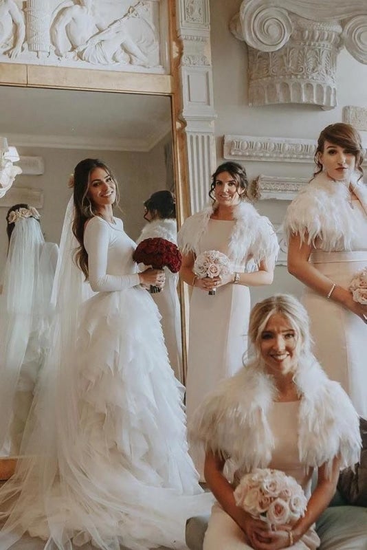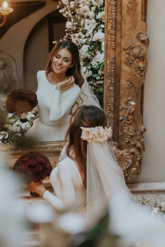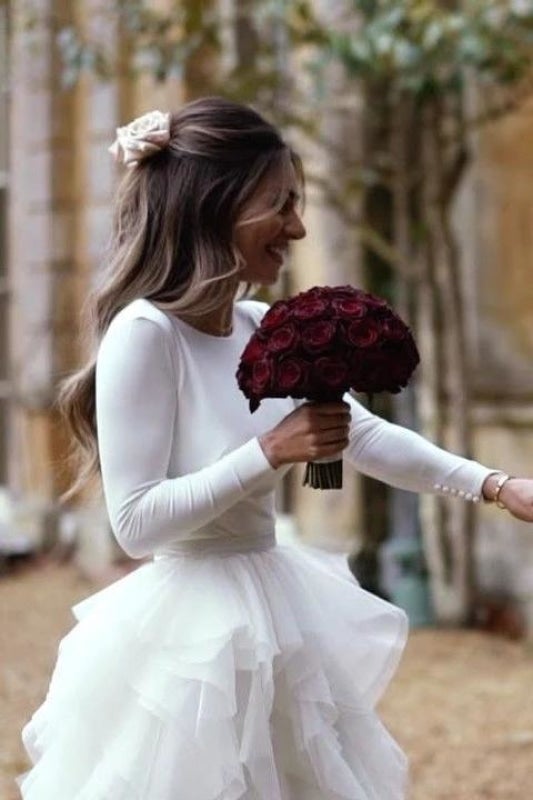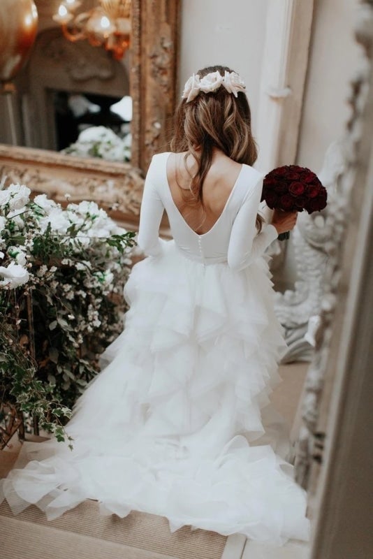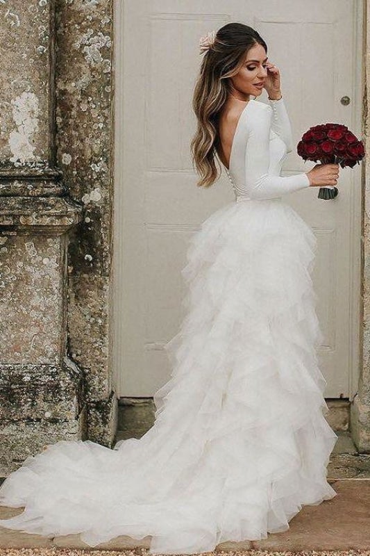 Vintage Round Neck Long Sleeves Wedding Dresses Ruched Tulle Bridal Gowns with Open Back Robe De Mariee