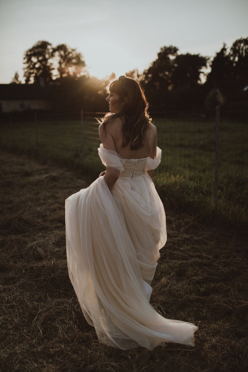 Off the Shoulder Champagne Wedding Gowns A Line Pleated Tulle Wedding Dress with Button Boho Bridal Dresses with Court Train