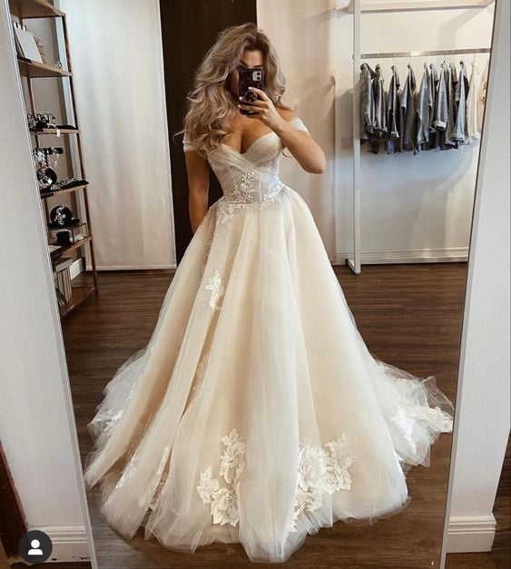 Off the Shoulder Tulle Wedding Dresses Lace Appliques Champagne Wedding Gowns A Line Simple Bridal Dress