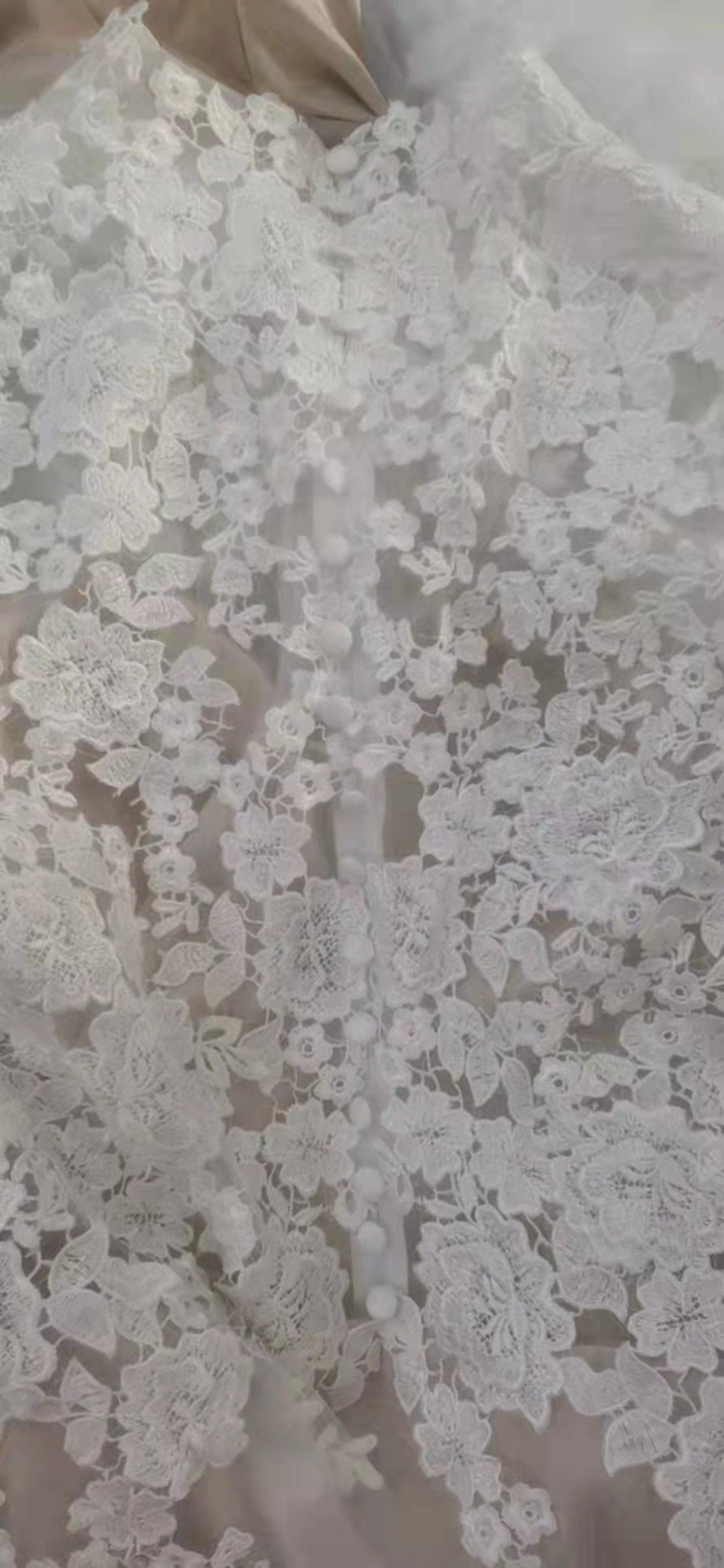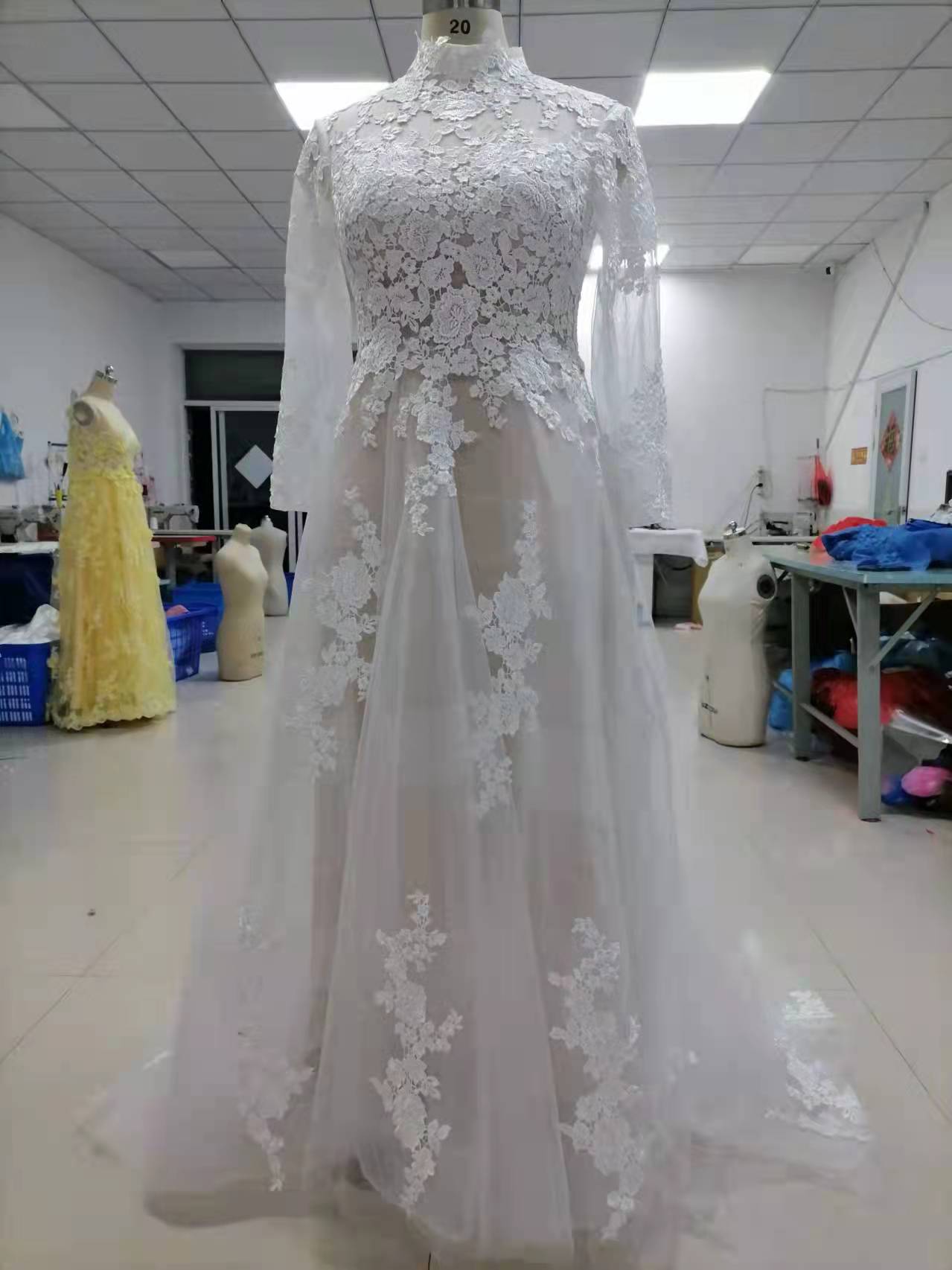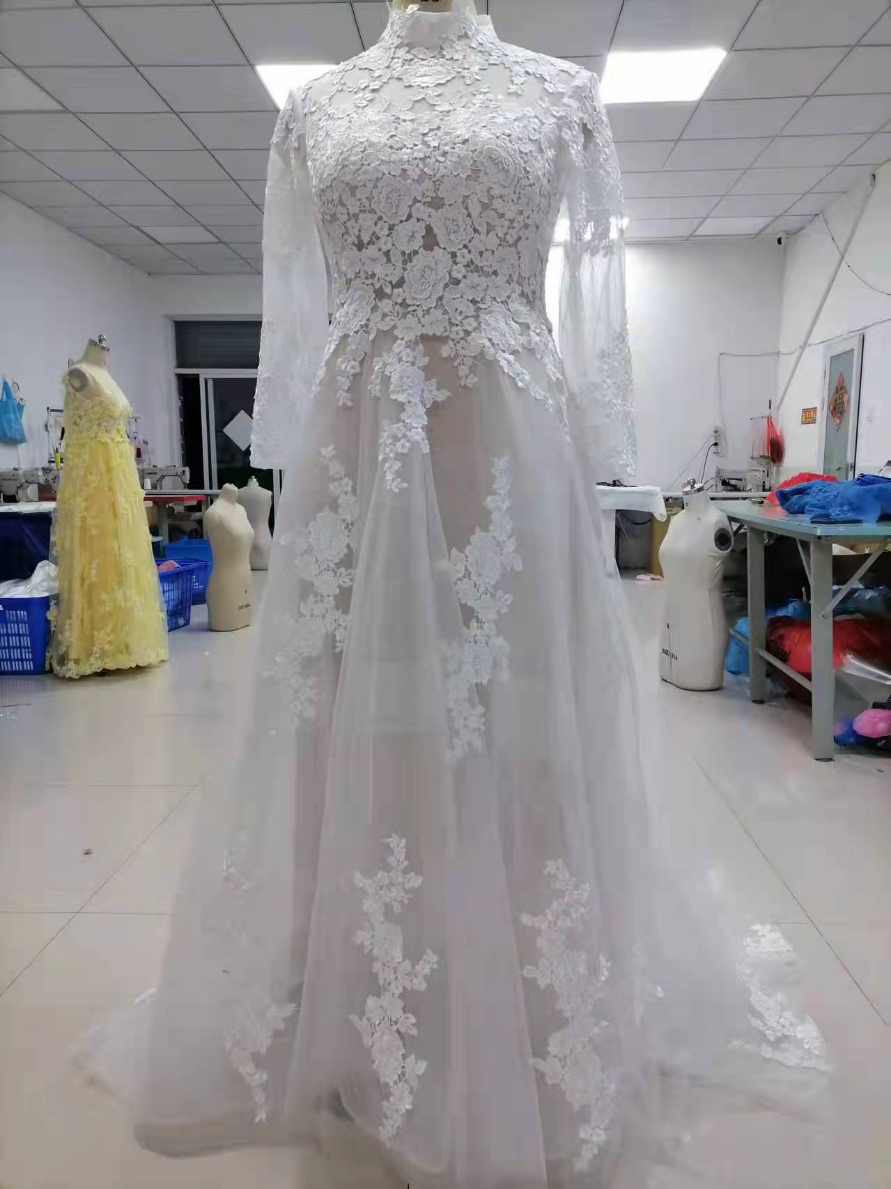 Real Photos High Neck Lace Wedding Dresses Champagne Lining Long Sleeves Wedding Gowns with Sweep Train Affordable Bridal Dress