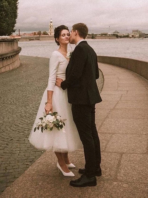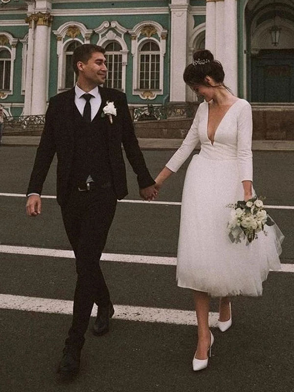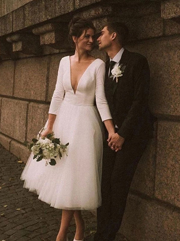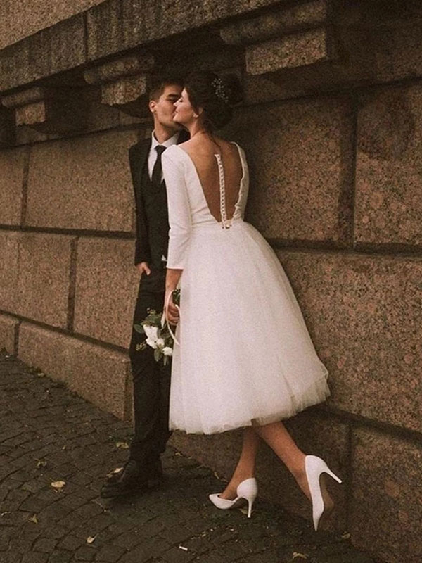 Satin and Tulle Wedding Dresses with 3/4 Sleeves, Tea-Length Bridal Gowns