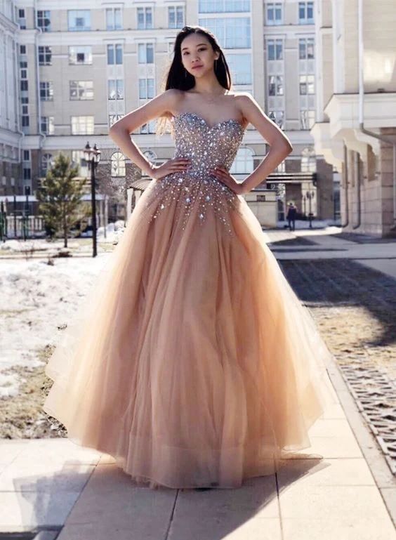 Champagne Long Evening Dresses, Long Prom Dresses, Wedding Party Dresses, Beaded Evening Dresses