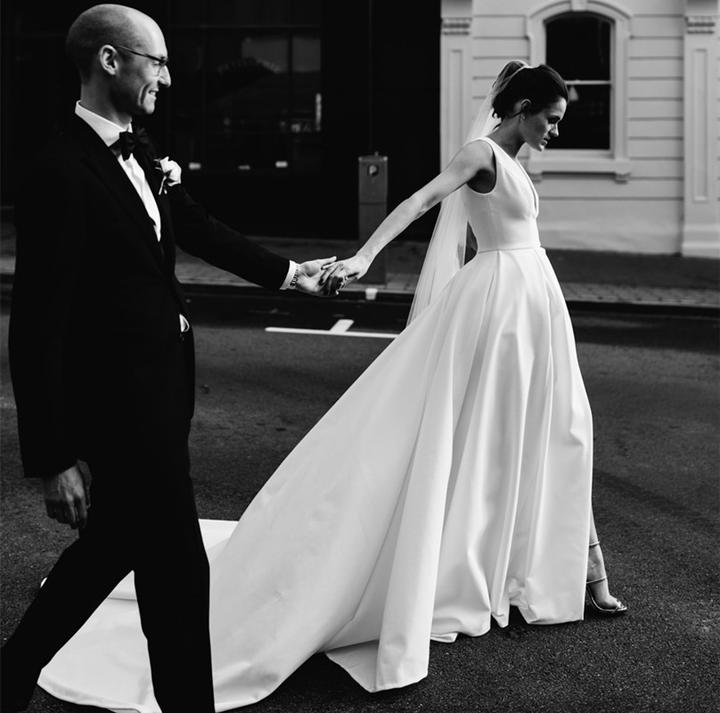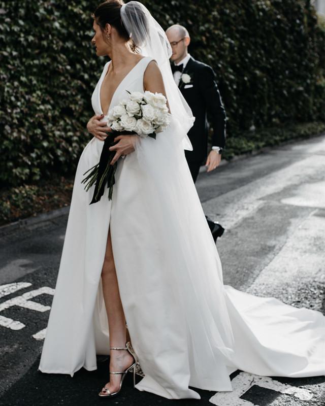 Deep V-Neck Sexy Wedding Dresses Pleated Satin Bridal Gowns Side Split Robes De Mariee with Court Train