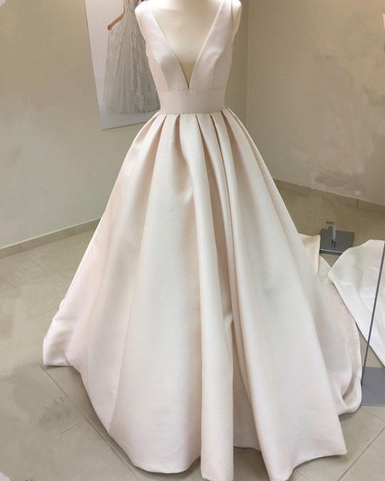 Deep V-Neck White Wedding Gowns Pleated Satin Bridal Dresses Lace Up Vestido De Novia