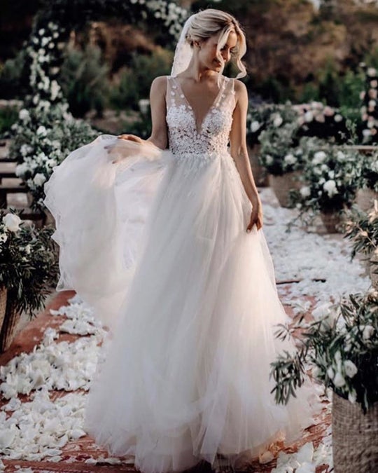 Sheer V-Neck Boho Wedding Dresses Lace Appliques Country Bridal Gowns Open-Back Robe De Mariee