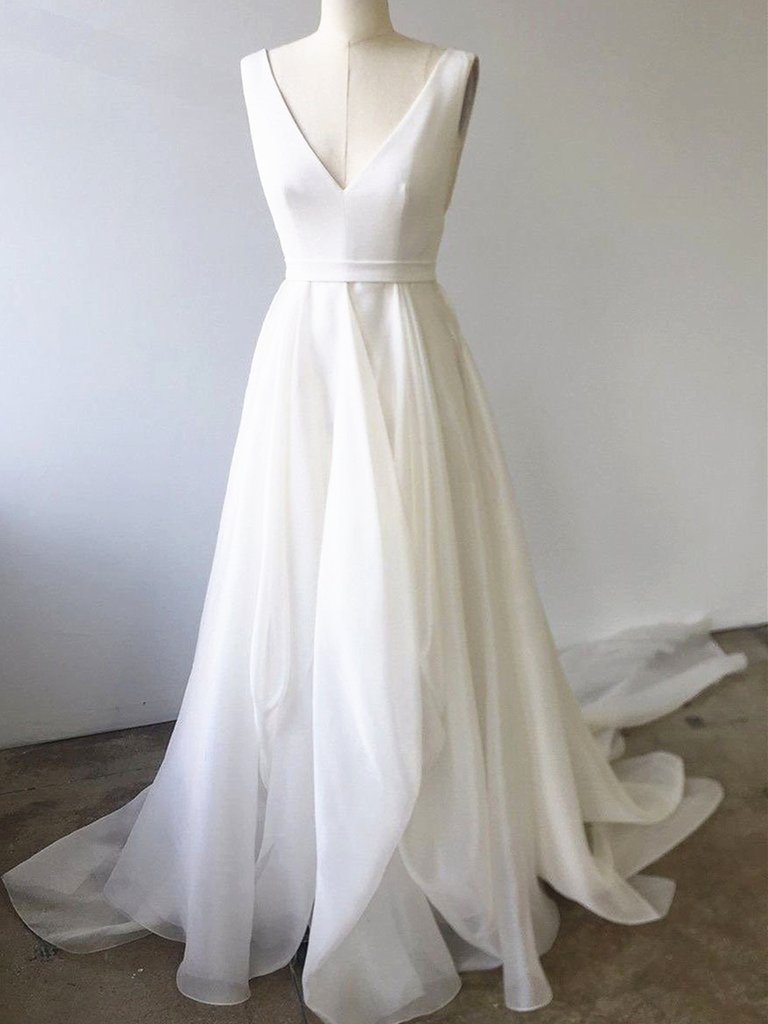 V-Neck White Silky Organza Bridal Dresses Sleeveless Chiffon Wedding Gowns Backless Robe De Mariee