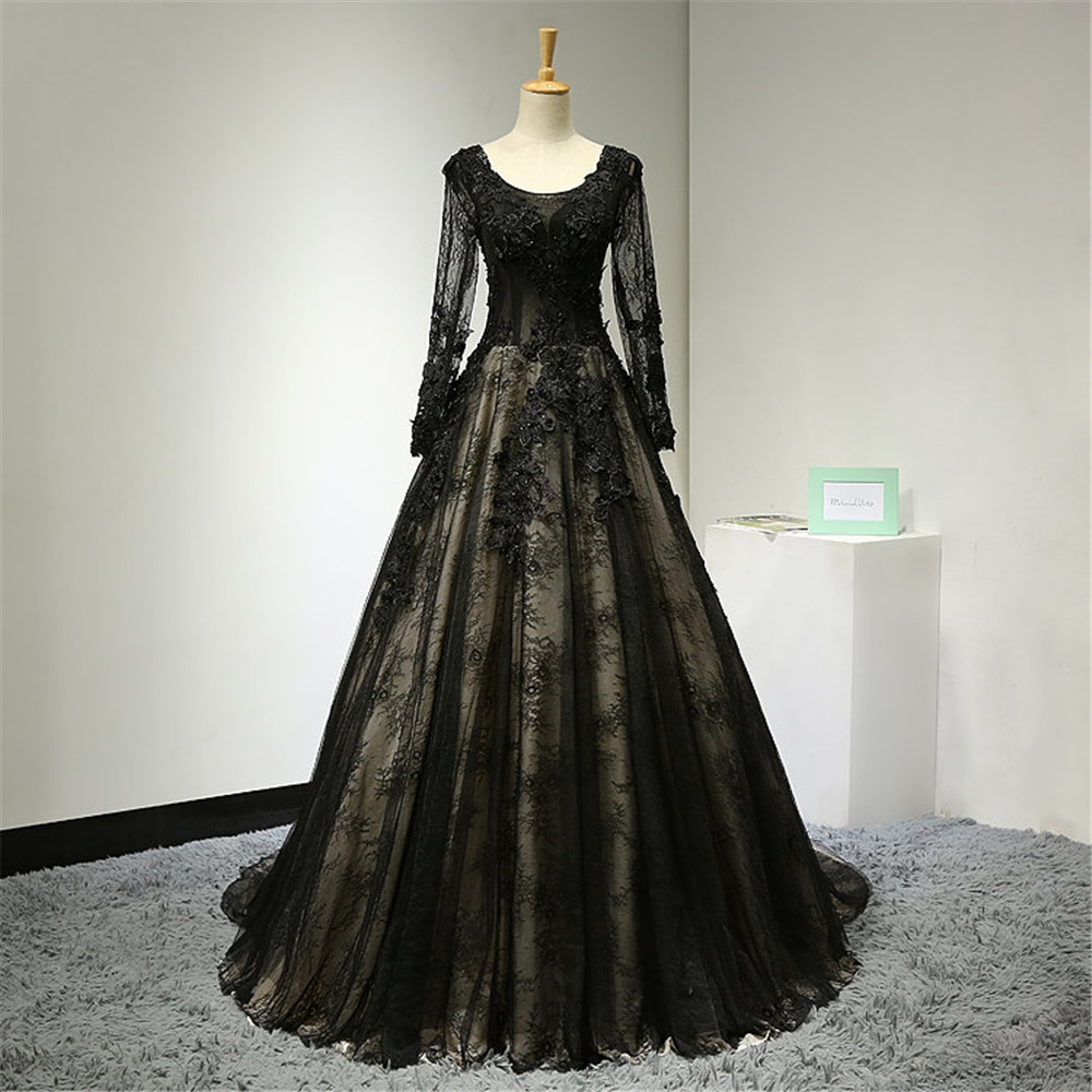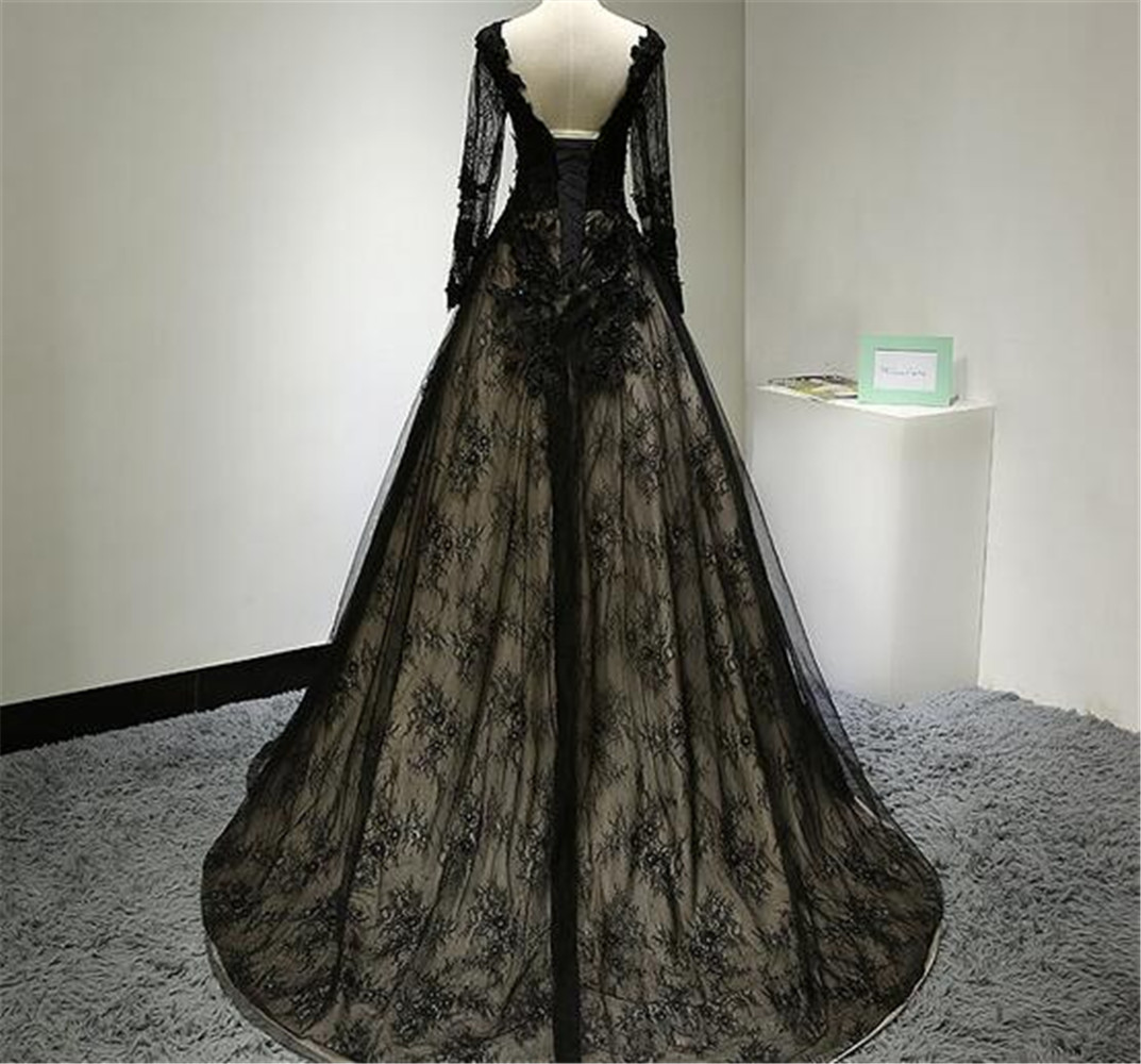 Scoop Gothic Wedding Dresses Lace Appliques Black Bridal Gowns Long Sleeves Vestido De Novia