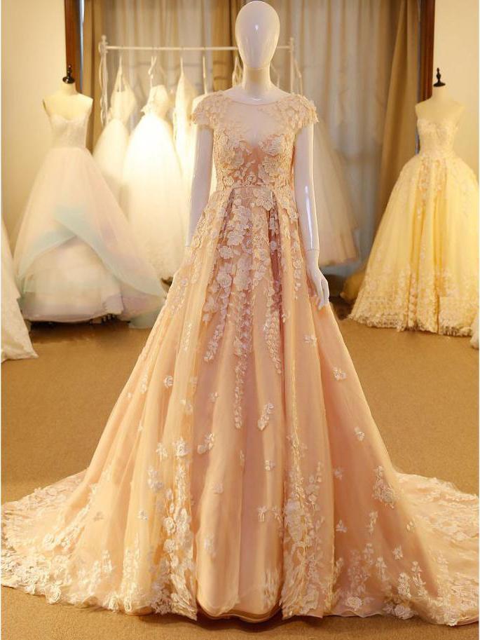 Sheer Round Neck Champagne Wedding Dresses Lace Appliques Floral Bridal Gowns Backless Robe De Mariee with Court Train