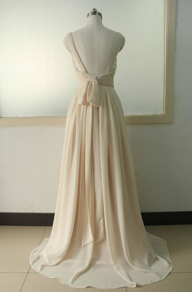 V-Neck Vintage Champagne Wedding Dresses Beaded Chiffon Bridal Gowns A Line Backless Vestido De Novia