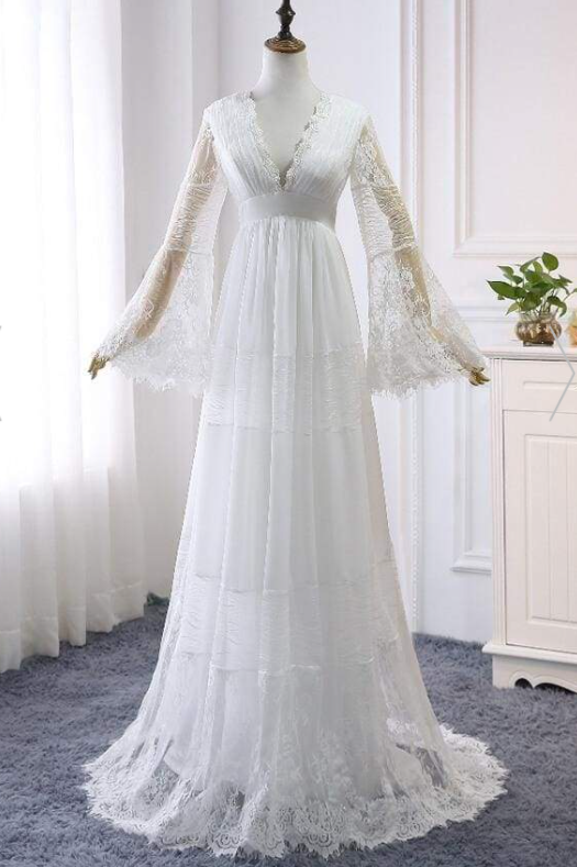 V-Neck Long Sleeves Wedding Dresses Pleated Boho Bridal Gowns A Line Robe De Mariage
