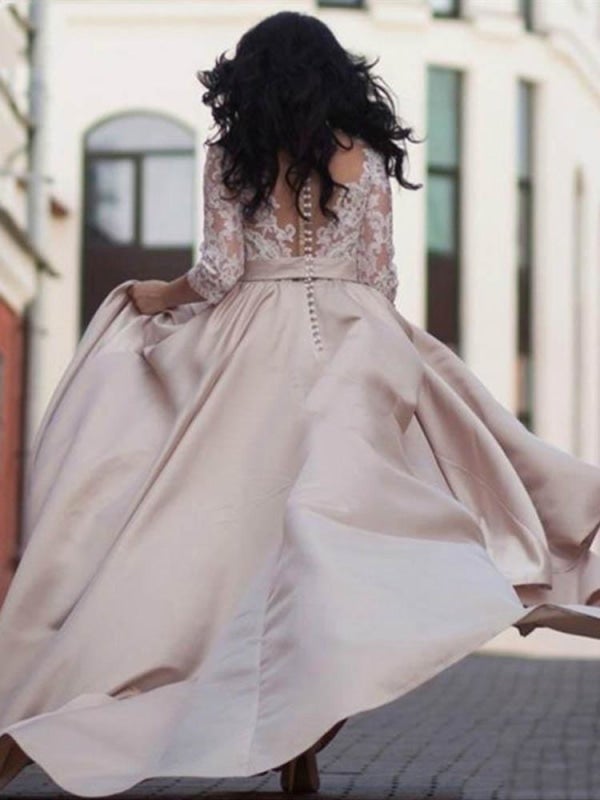 Elegant V-Neck Lace Top Champagne Wedding Dresses 1/2 Sleeves Vintage Bridal Gowns with Sheer Back Boho Wedding Gowns