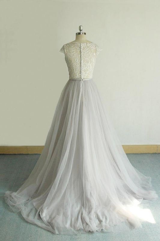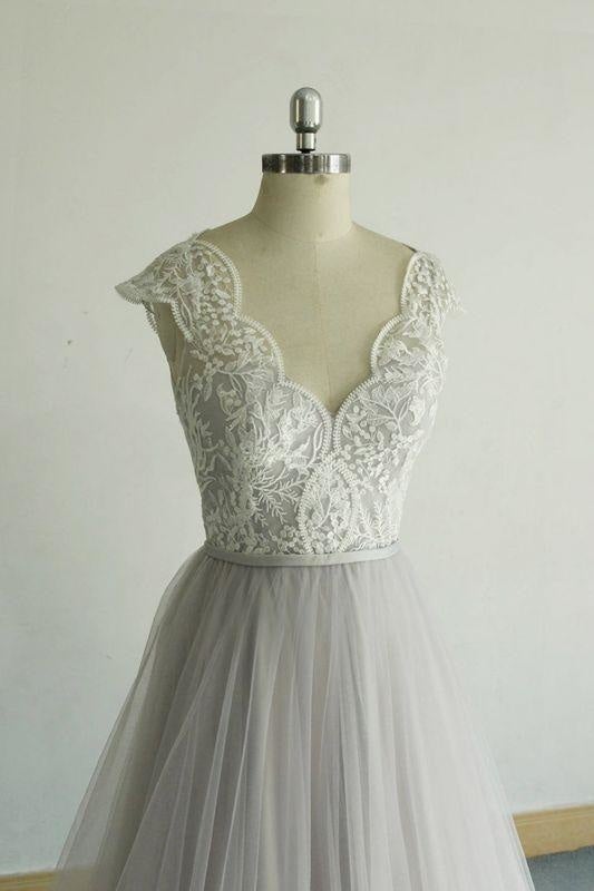 Elegant V-Neck Gray Wedding Gowns Lace Appliques Boho Bridal Dress with Button Pretty Wedding Dresses