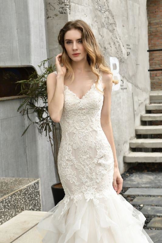 Elegant V-Neck Ivory Lace Wedding Dresses Ruffle Tulle Mermaid Bridal Dress with Lace Up Back Beach Wedding Gowns