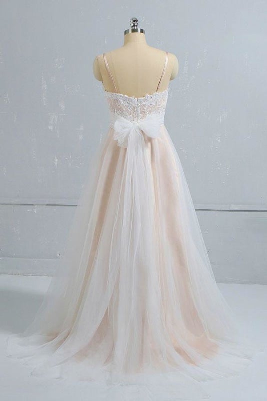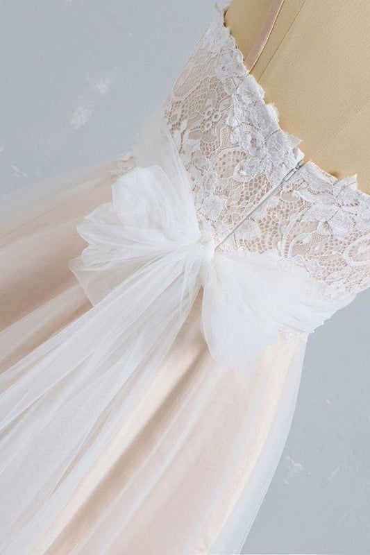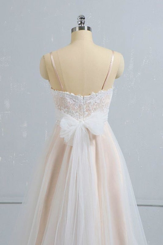 Spaghetti Straps Boho Wedding Dresses Lace Appliques Champagne Wedding Gowns A Line Bridal Wear Robe De Mariee with Bow