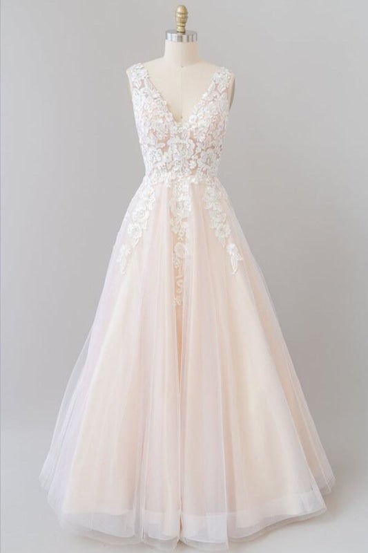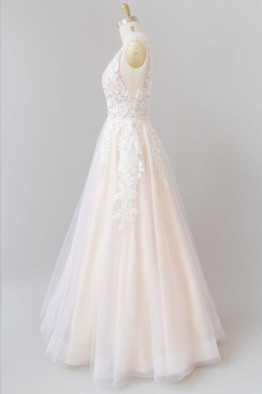 Exquisite V-Neck Champagne Wedding Dresses Floral Lace Appliques Boho Bridal Dress A Line Backless Wedding Gowns