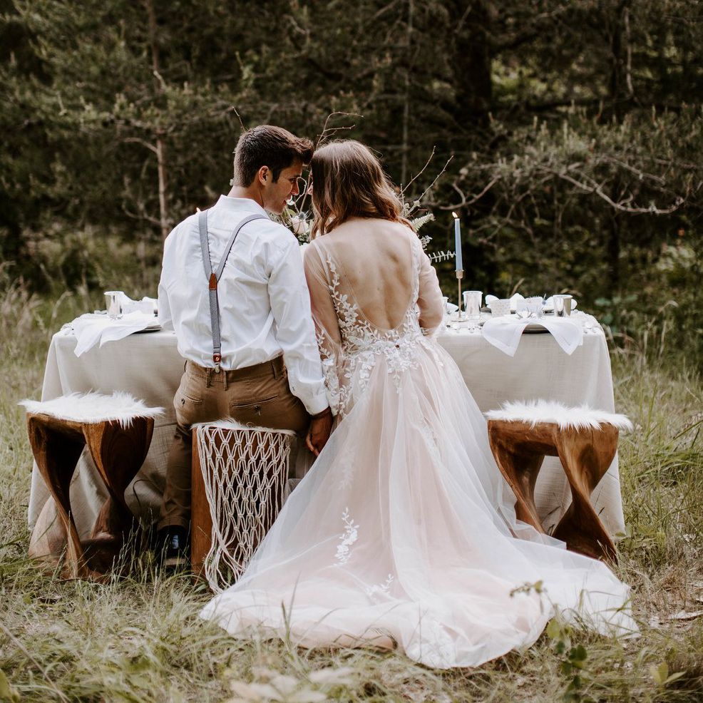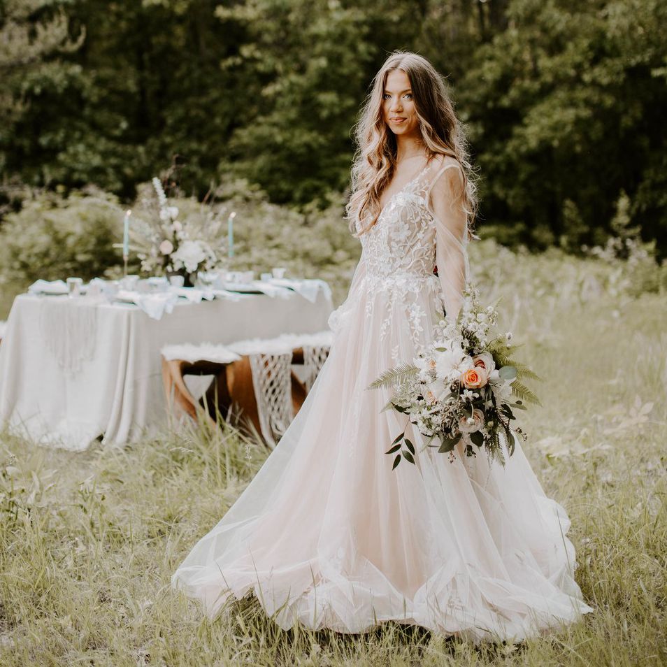 Exquisite V-Neck Floral Lace Long Sleeves Wedding Dresses A Line Boho Bridal Dress Backless Country Wedding Gowns