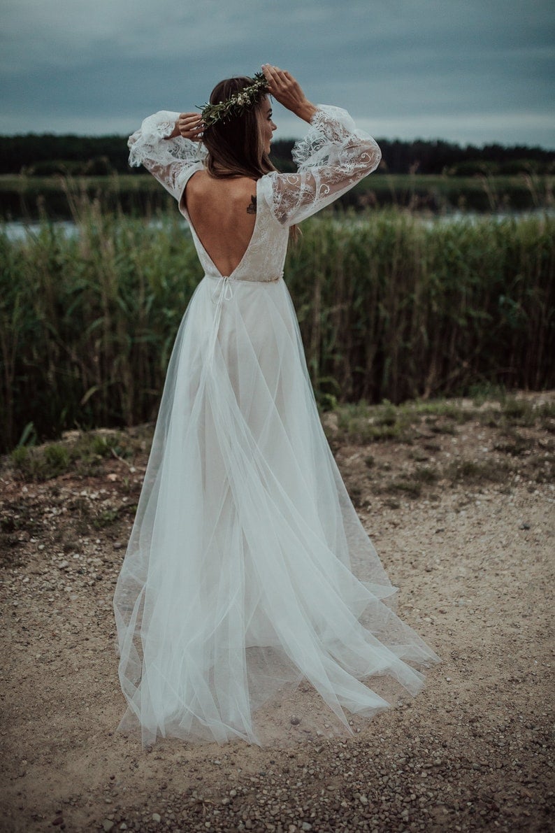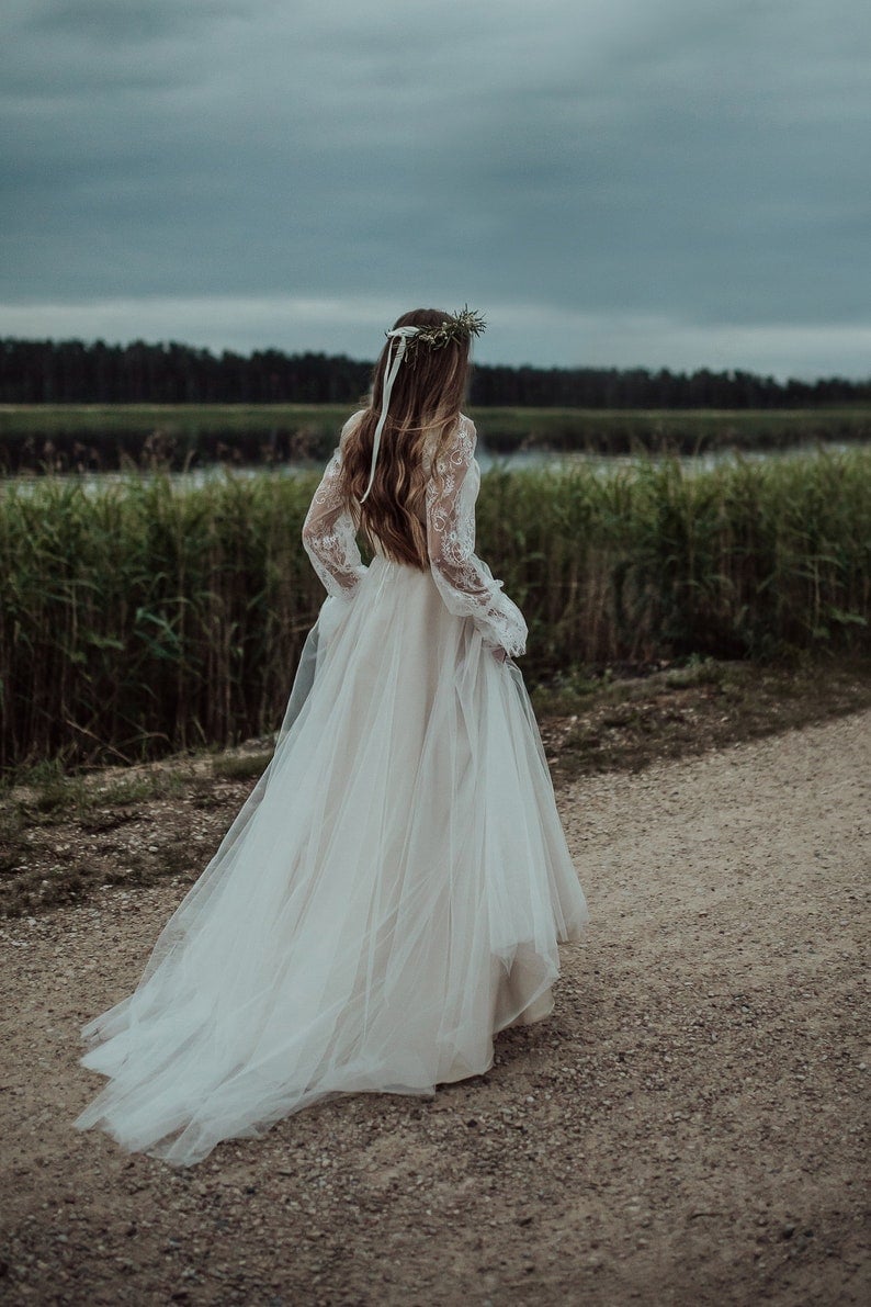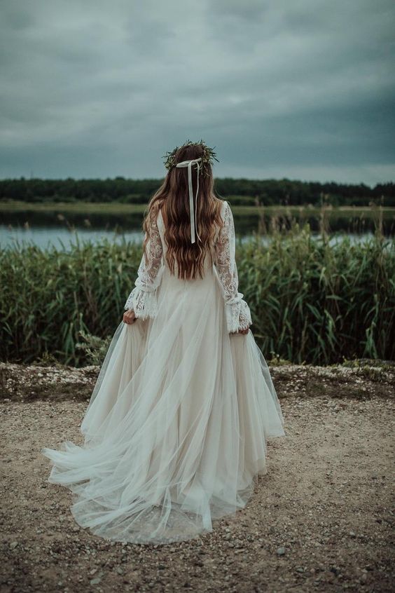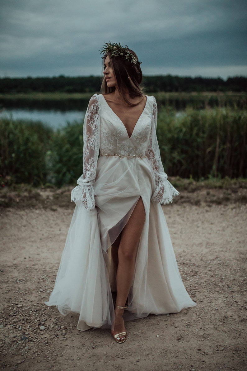 Vintage V-Neck Bohemian Tulle Wedding Dresses Ivory Lace Long Sleeves Wedding Gowns Side Split Elegant Bridal Dress Robe De Mariee