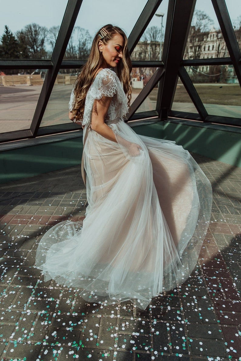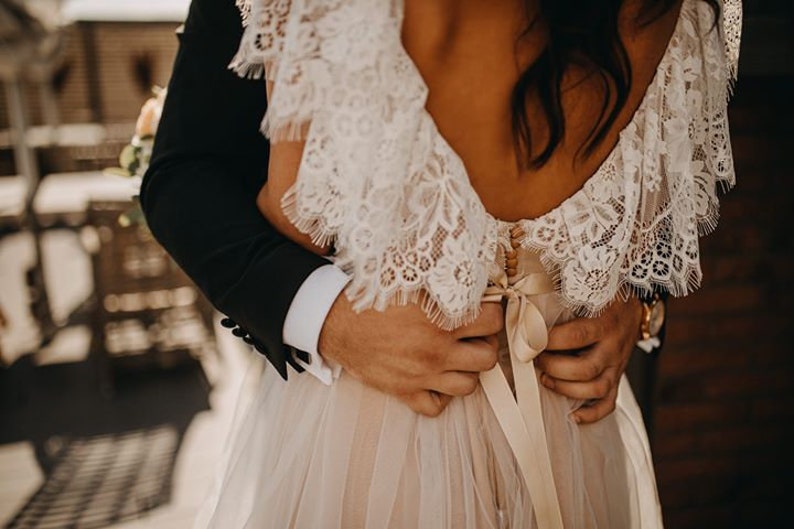 Lace Open Back Champagne Wedding Dresses V-Neck Boho Bridal Dress A Line Tulle Wedding Gowns with Satin Ribbon