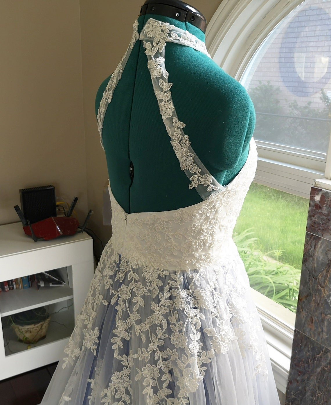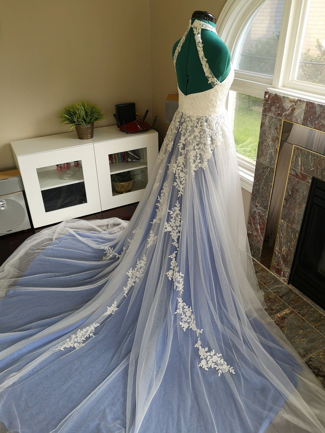 Open Back Lace Wedding Dresses Blue Tulle Wedding Gowns A Line Boho Bridal Dress with Court Train