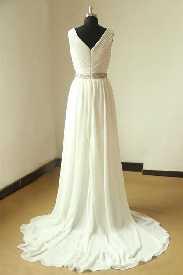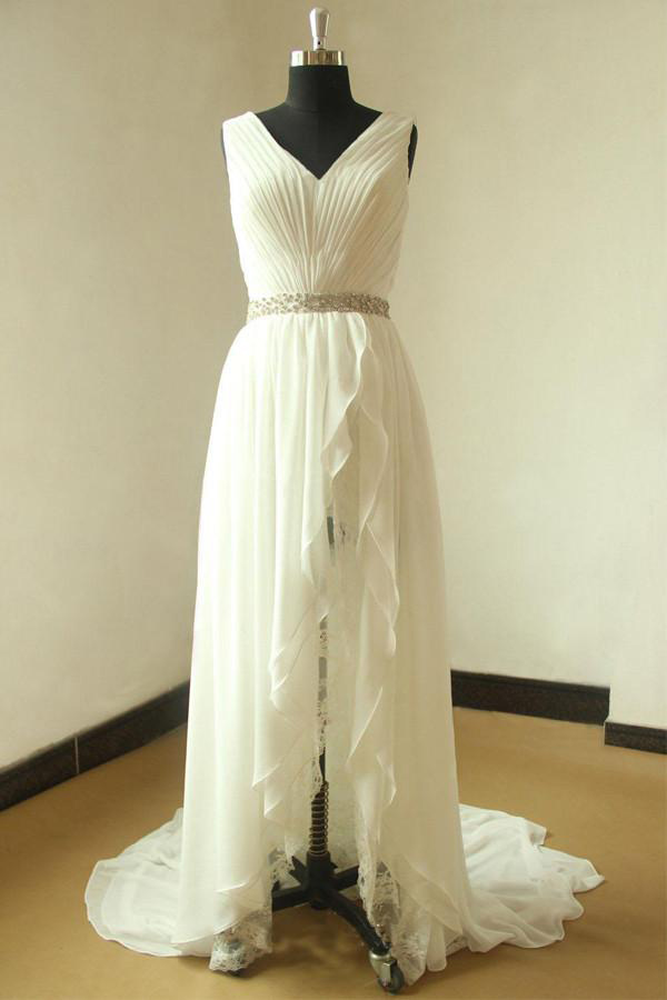 V-Neck Vintage Wedding Dresses Pleated Chiffon Bridal Dress Front Split Ivory Wedding Gowns