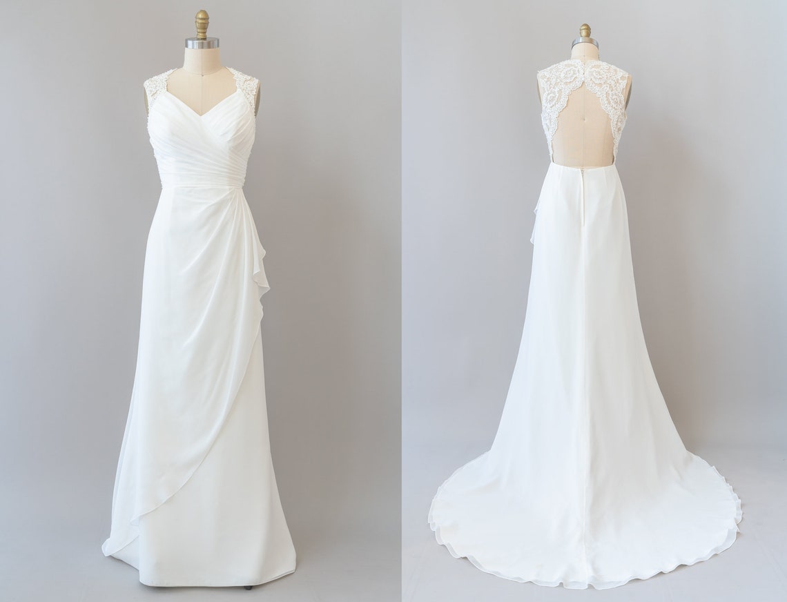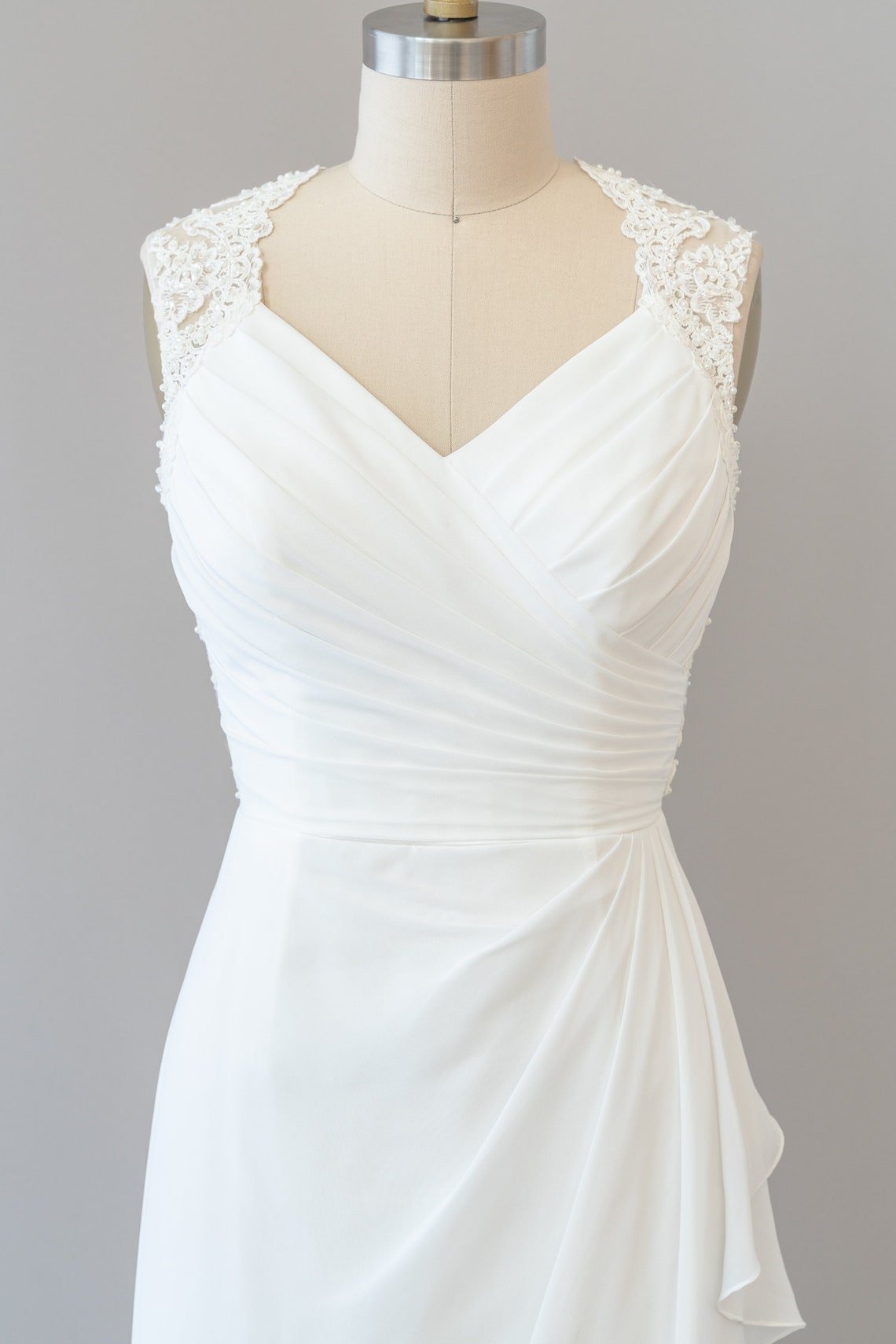 Vintage V-Neck Ruffle Chiffon Wedding Dresses Sheath Simple Wedding Gowns with Open Lace Back Country Bridal Dress Vestido De Novia