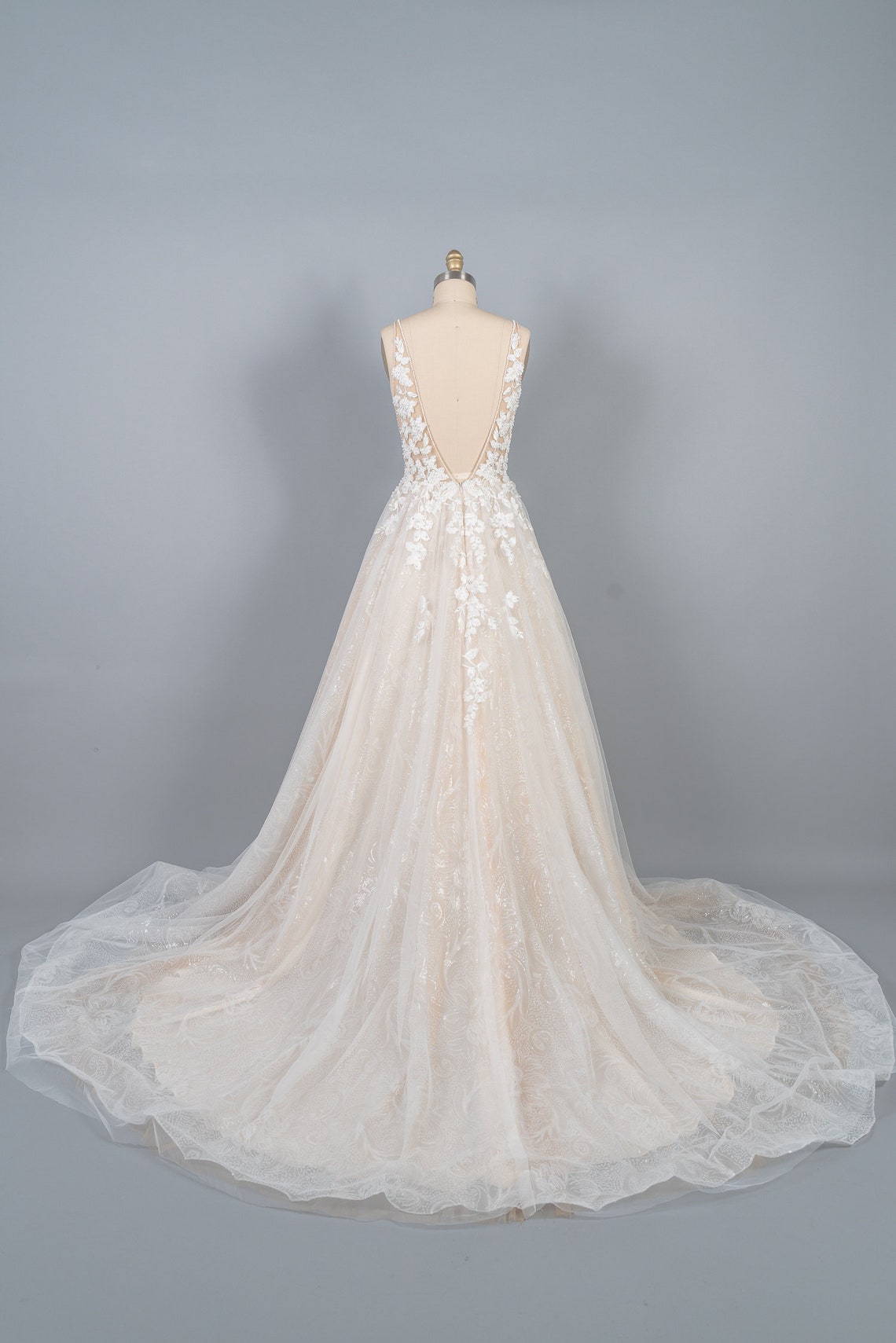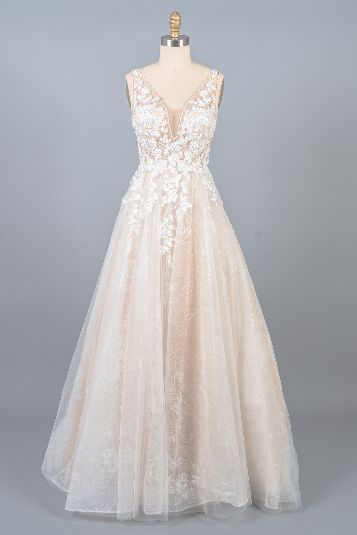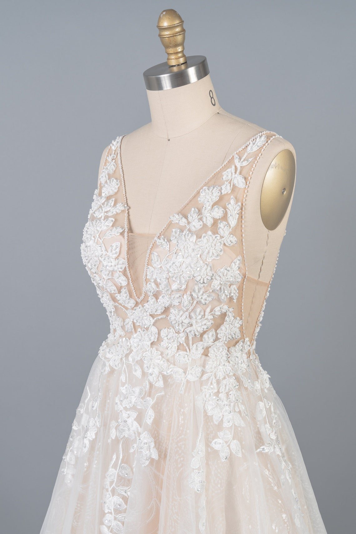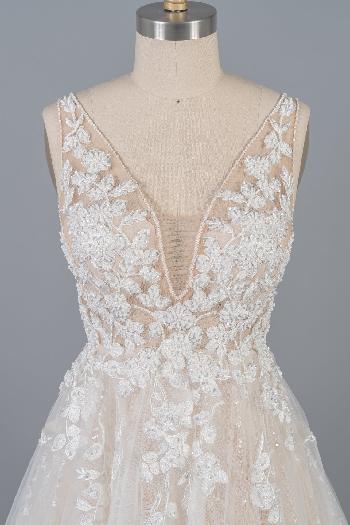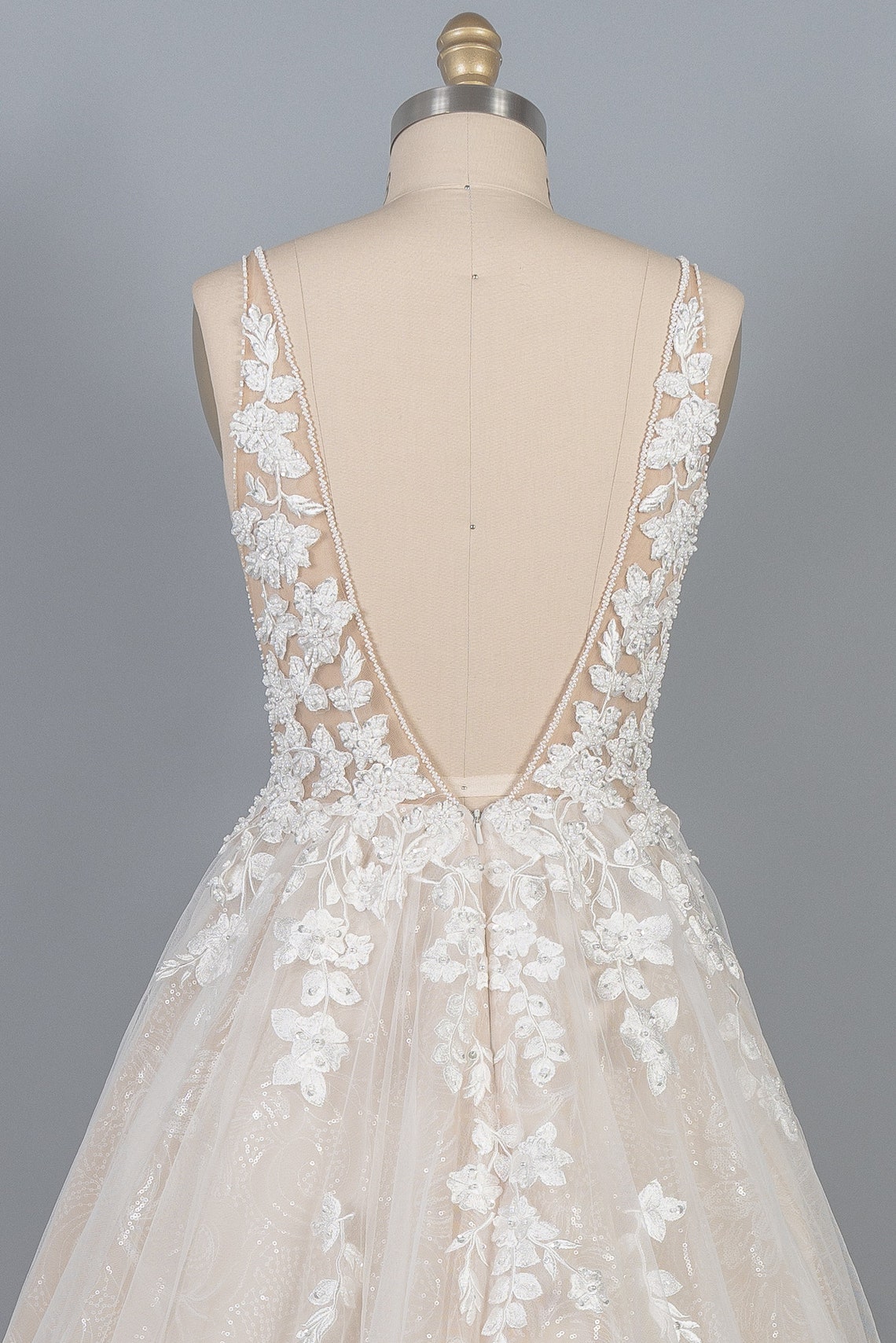 Elegant V-Neck Champagne Wedding Dresses Floral Lace Wedding Gowns Backless Sexy Bridal Dress Robe De Mariee