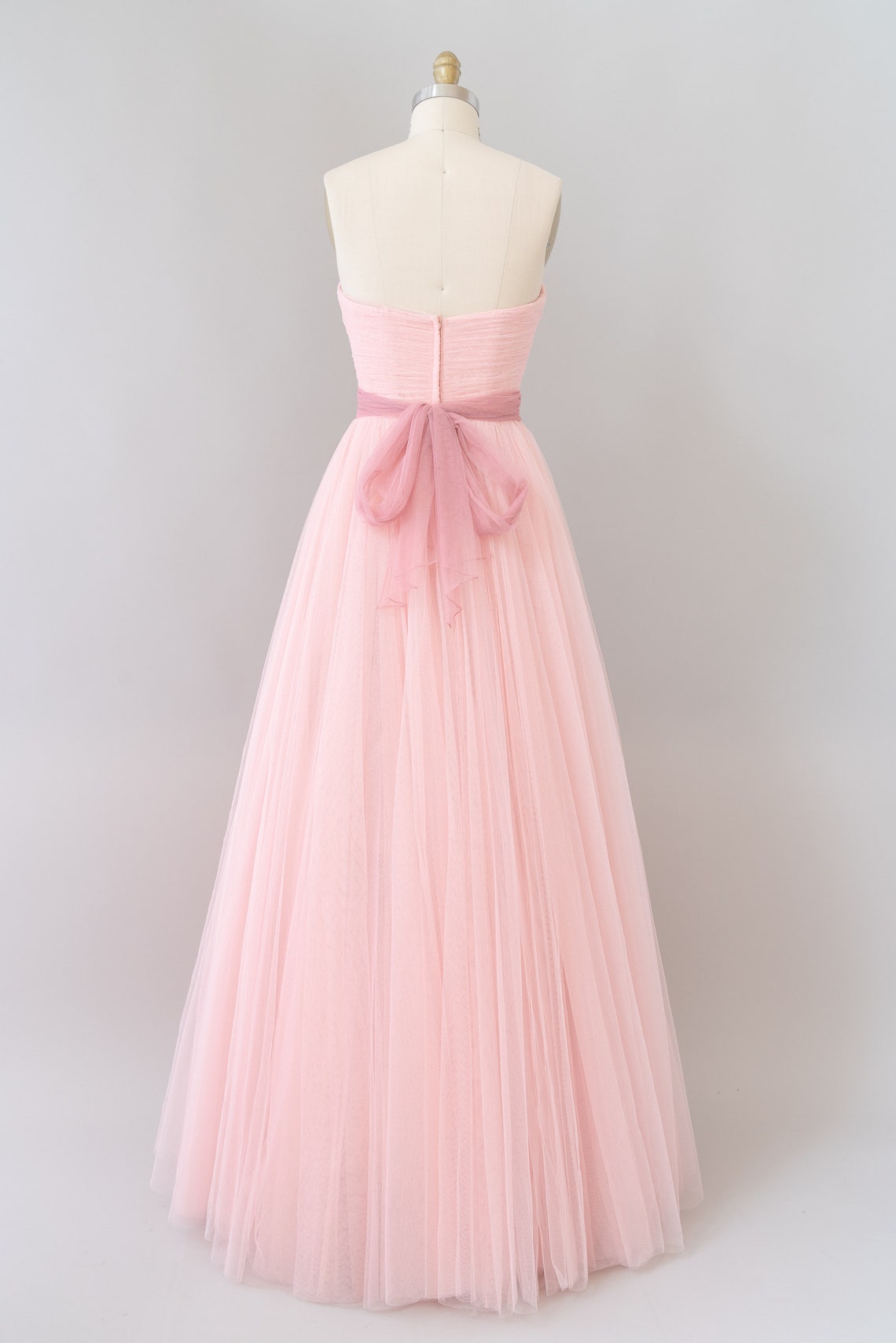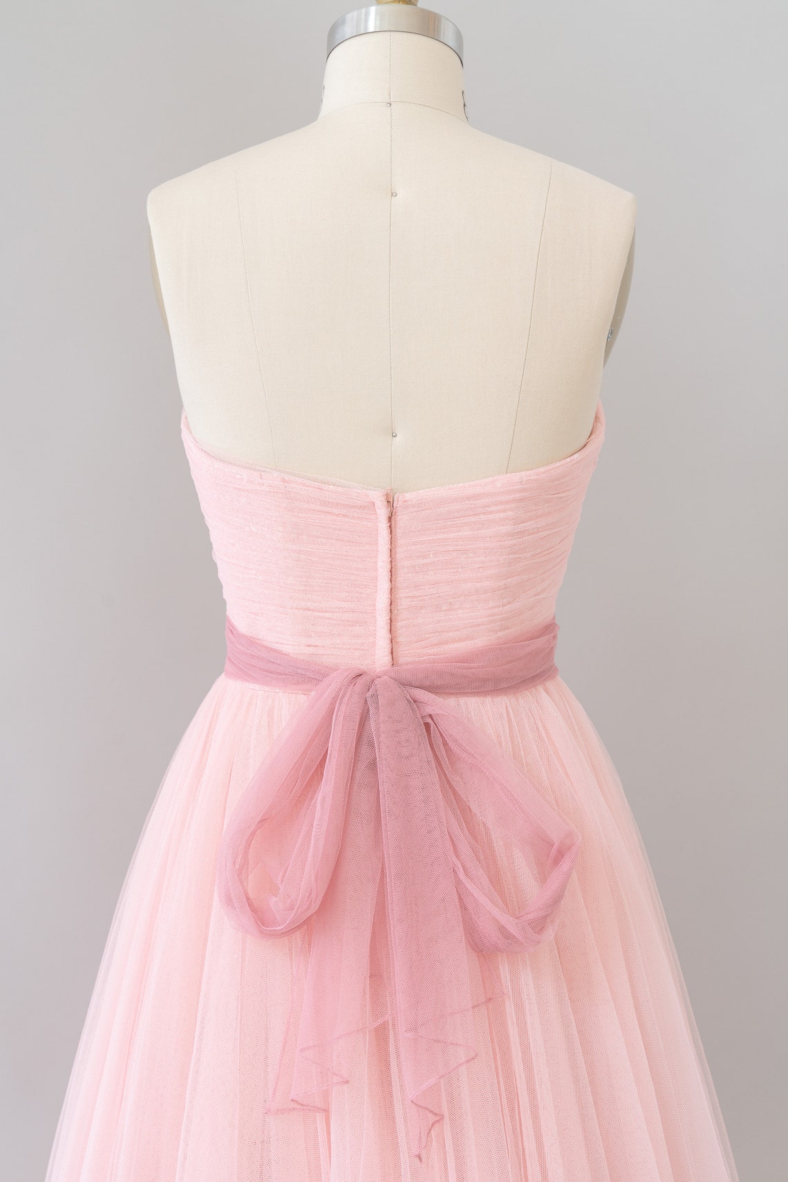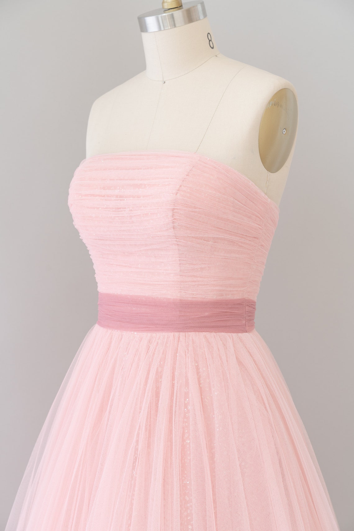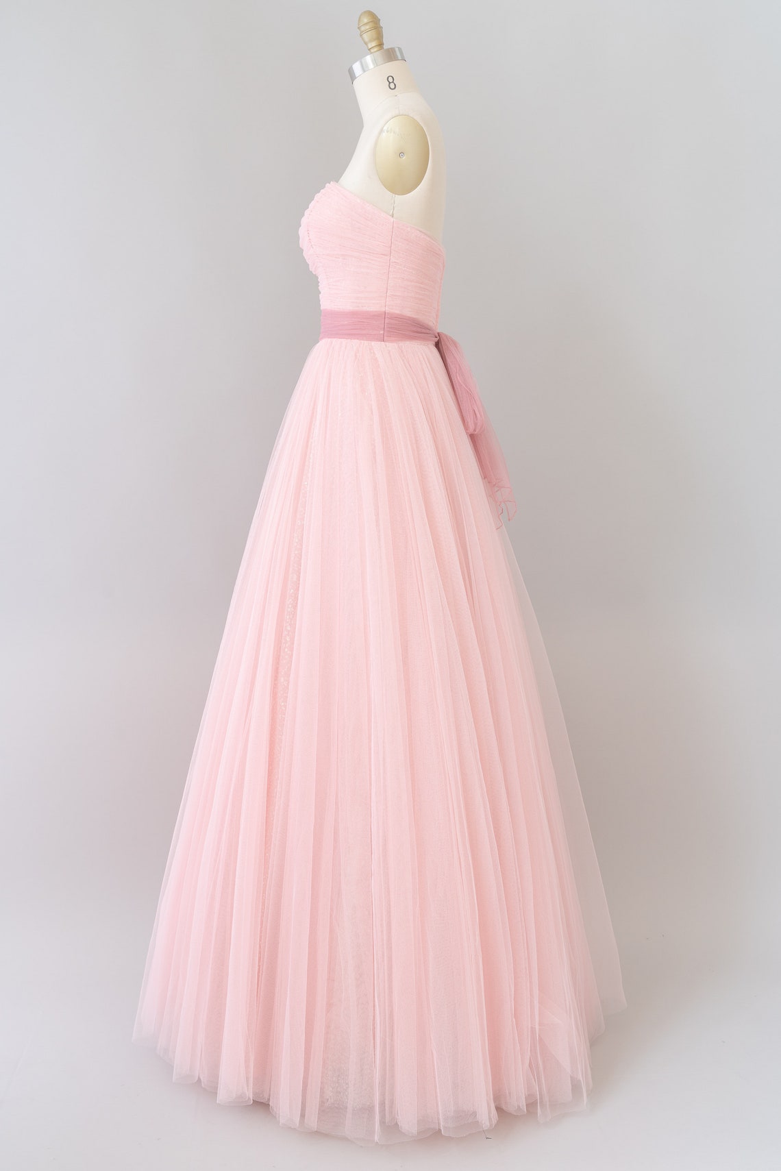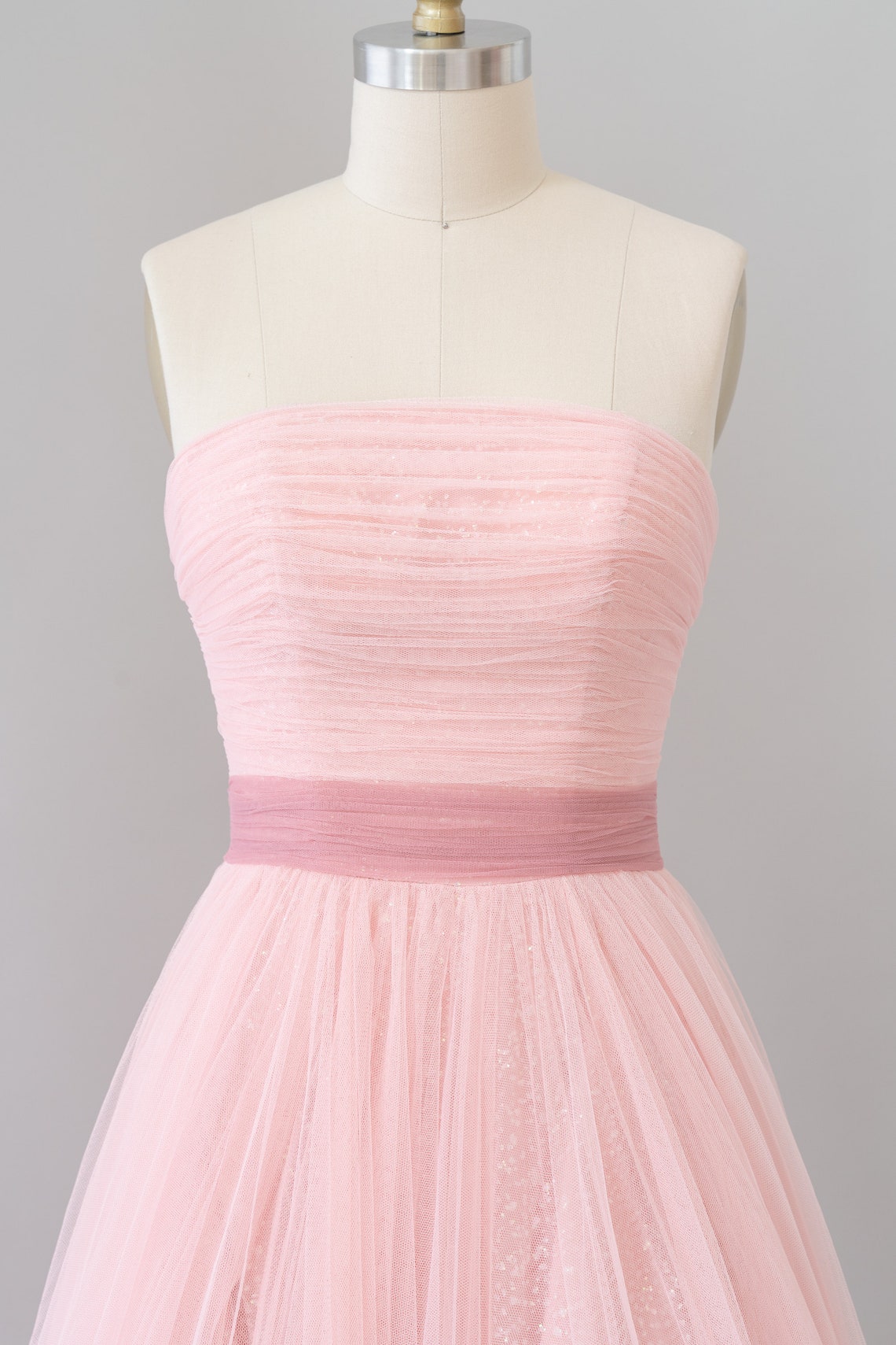 Strapless Pink Bridesmaid Dresses A Line Tulle Maid of Honor Dress with Bow Floor Length Wedding Party Gowns