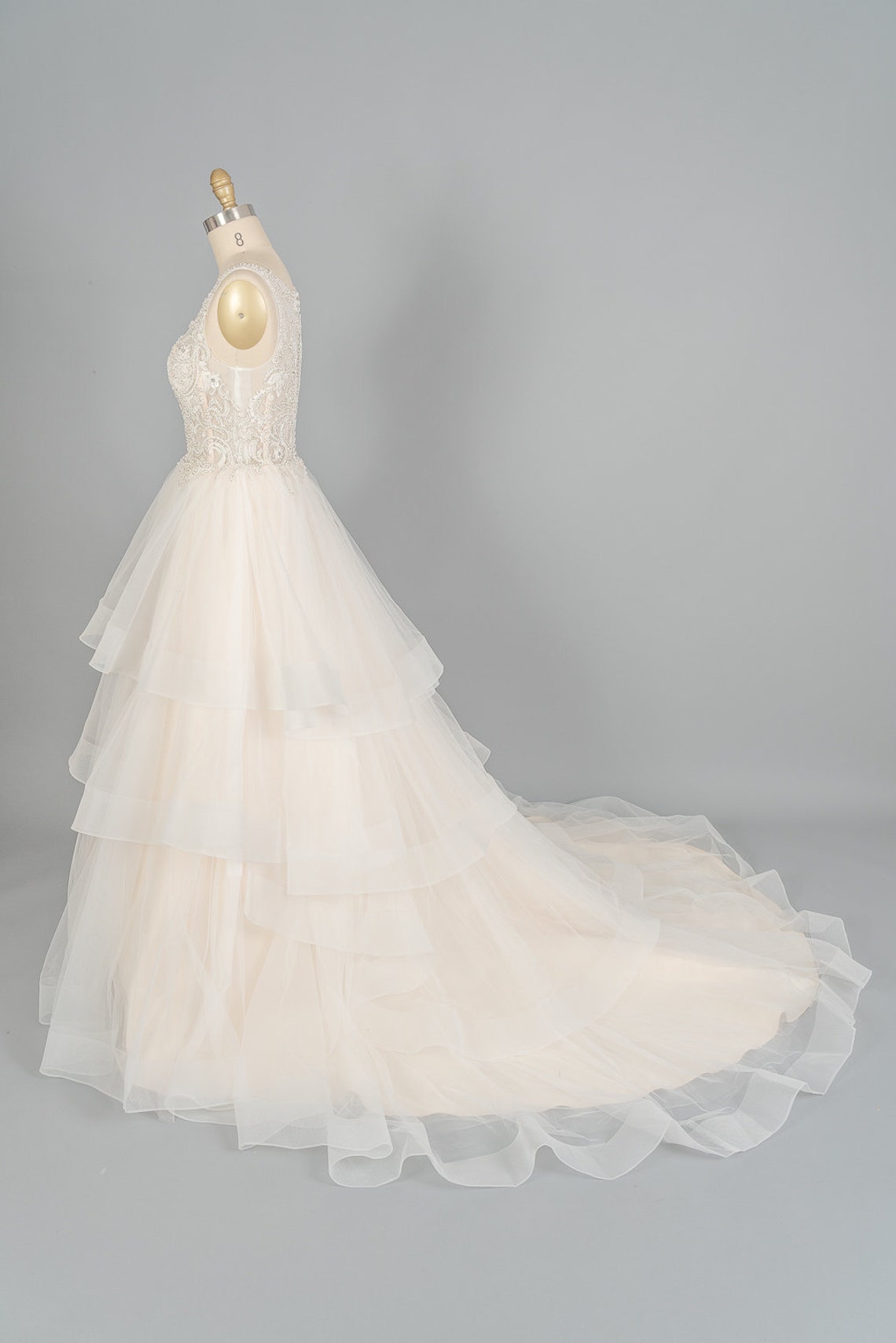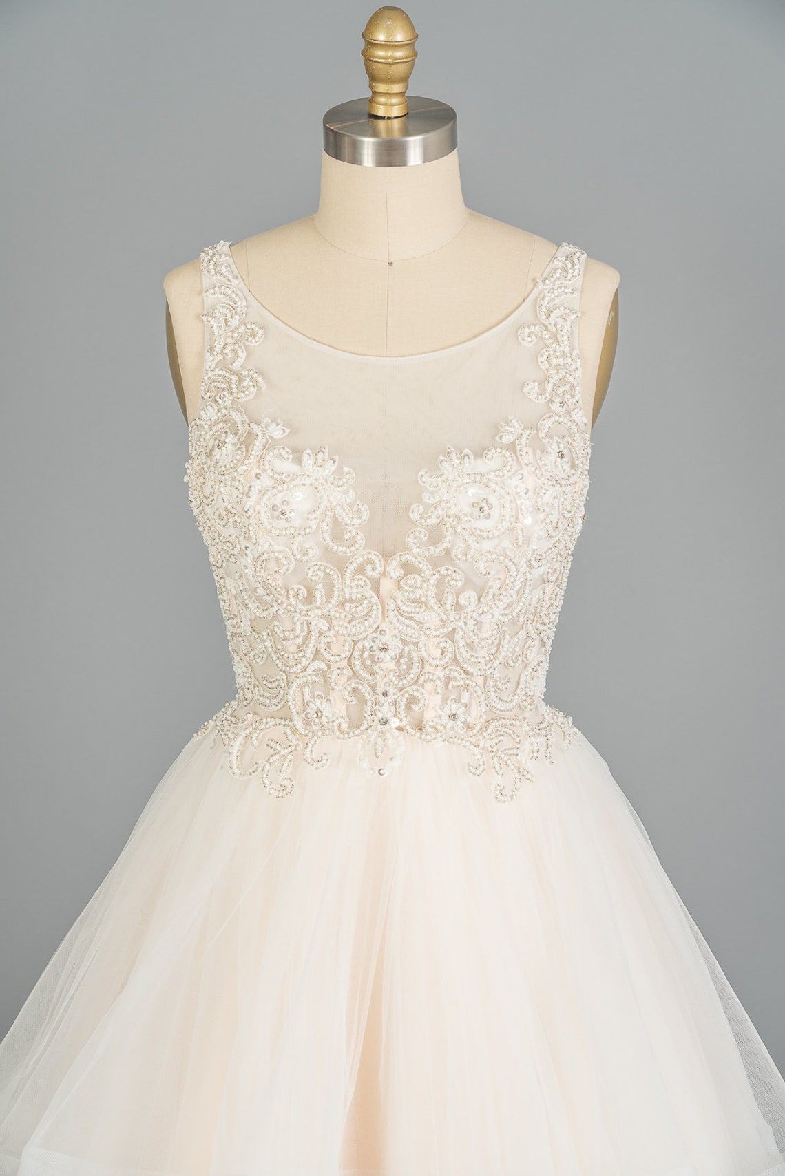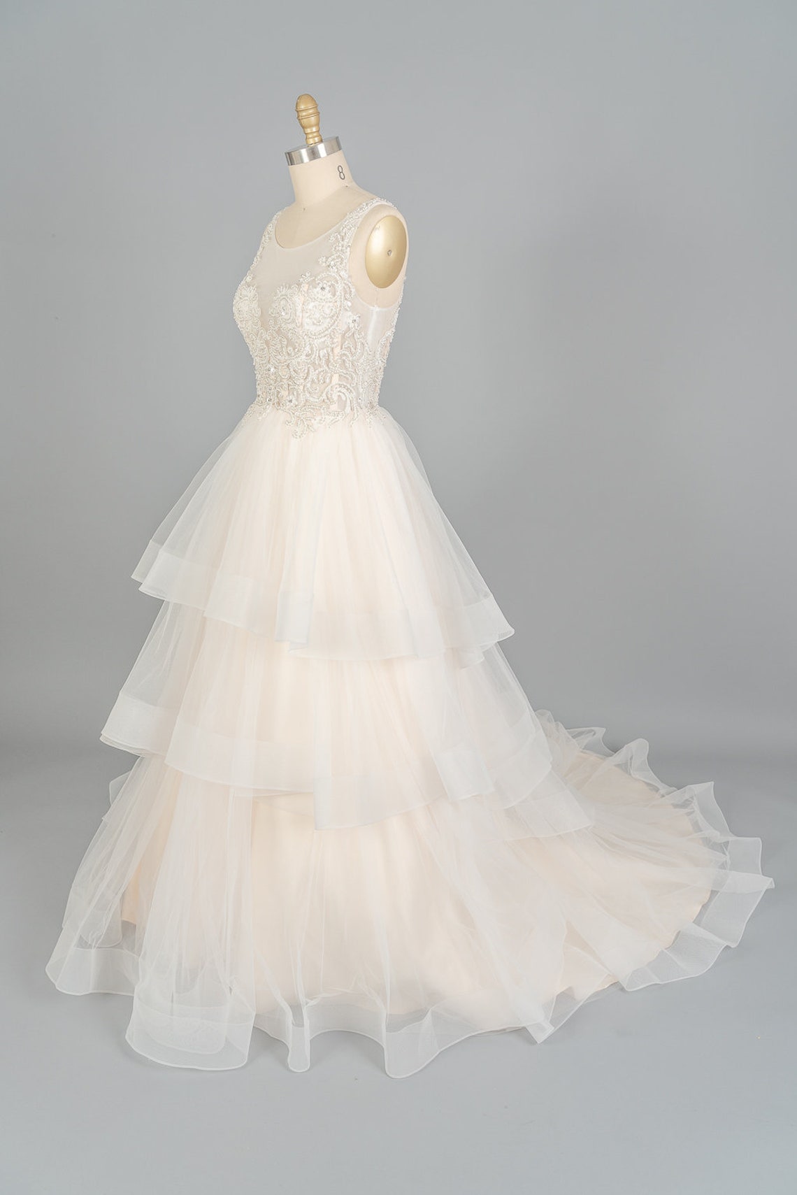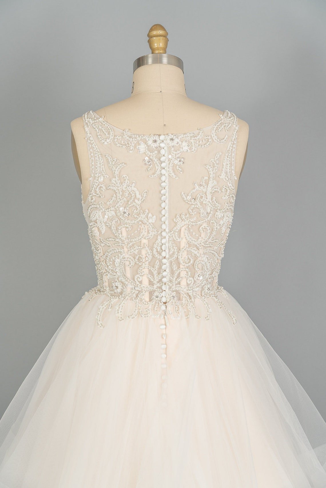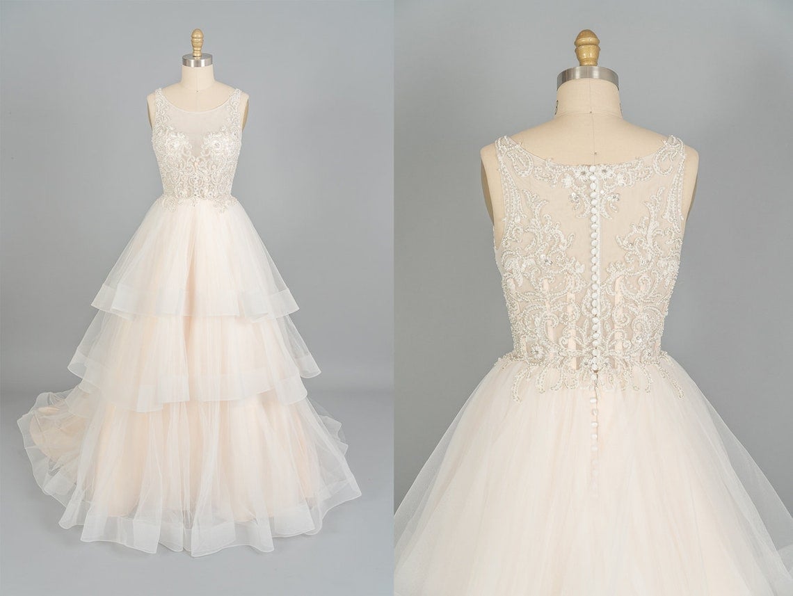 Sheer Round Neck Lace Bridal Dresses Tiered Tulle Boho Wedding Dress With Button Ivory Wedding Gowns