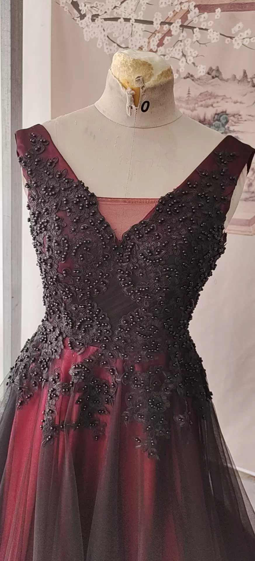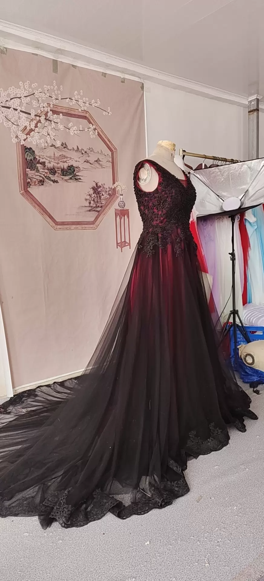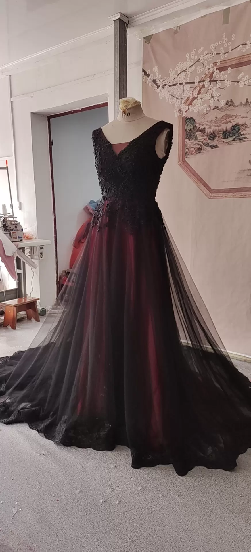 Illusion V-Neck Black and Red Wedding Dresses Major Beaded Gothic Wedding Gowns Lace Appliques Affordable Bridal Dress Robe De Mariee