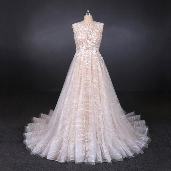 Round Neck Floral Lace Wedding Dresses A Line Champagne Wedding Gowns with Open Back Affordable Bridal Dress Vestido De Novia