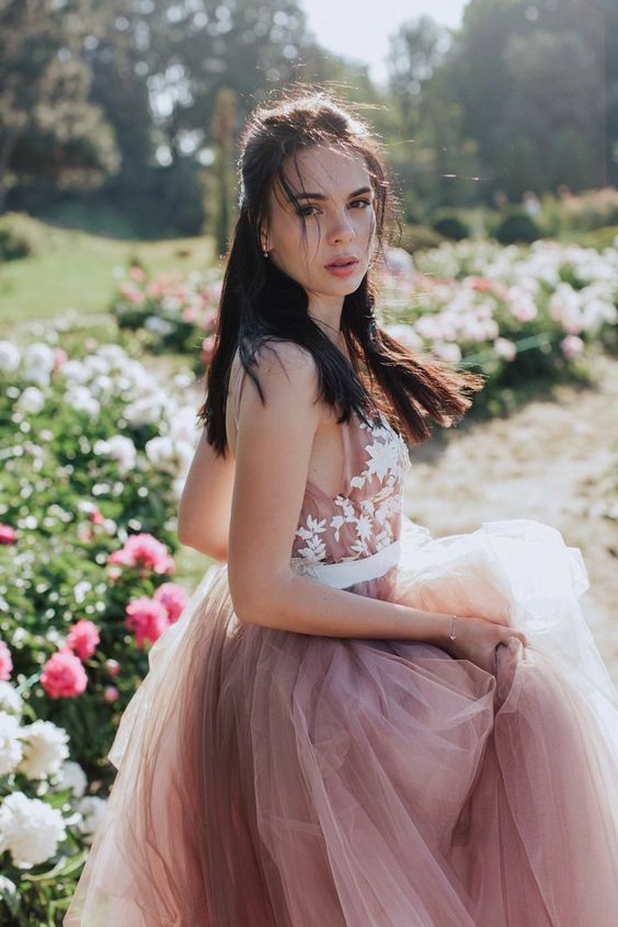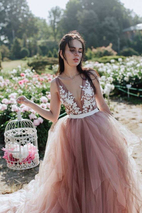 A Line Dusty Pink Wedding Dresses Lace Appliques Tulle Bridal Dress with Low Back Beach Wedding Gowns
