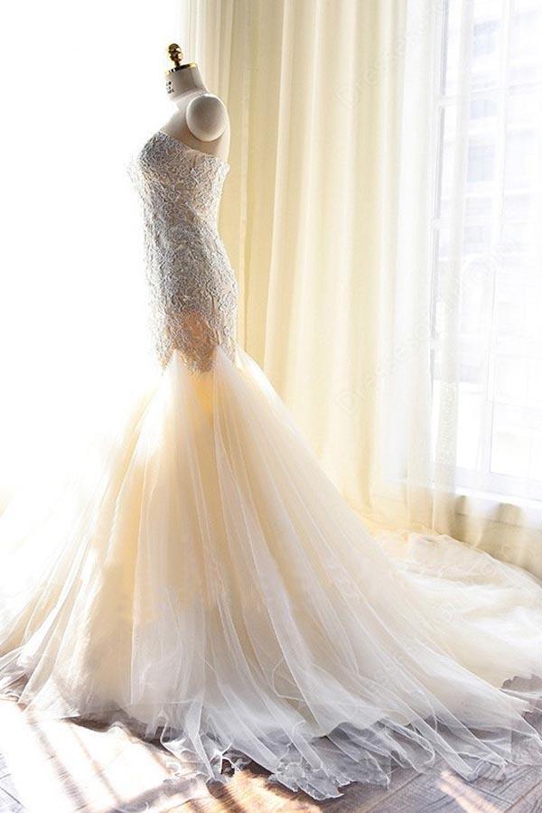 Charming Sweetheart Mermaid Wedding Dresses Lace Appliques Champagne Bridal Dress Ruffle Tulle Wedding Gowns