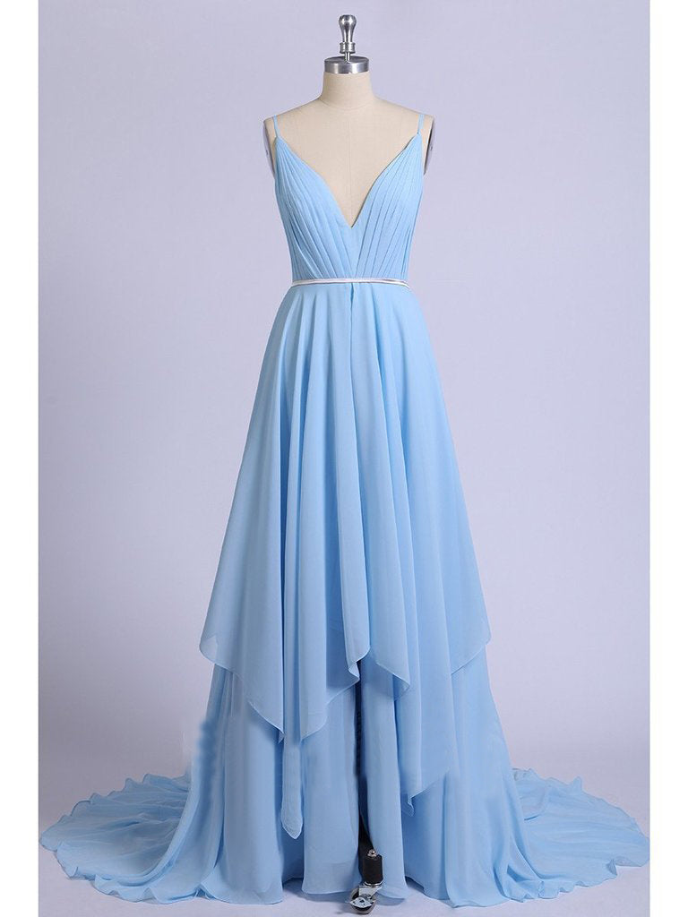Spaghetti Straps Sky Blue Prom Dresses A Line Pleated Chiffon Evening Gowns Side Split Simple Party Dress