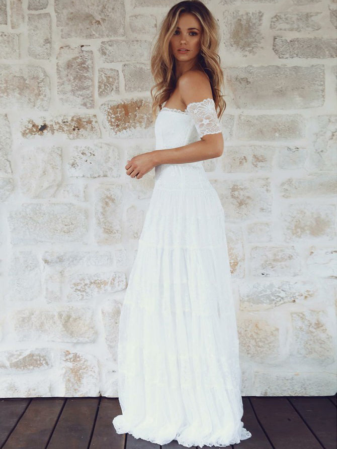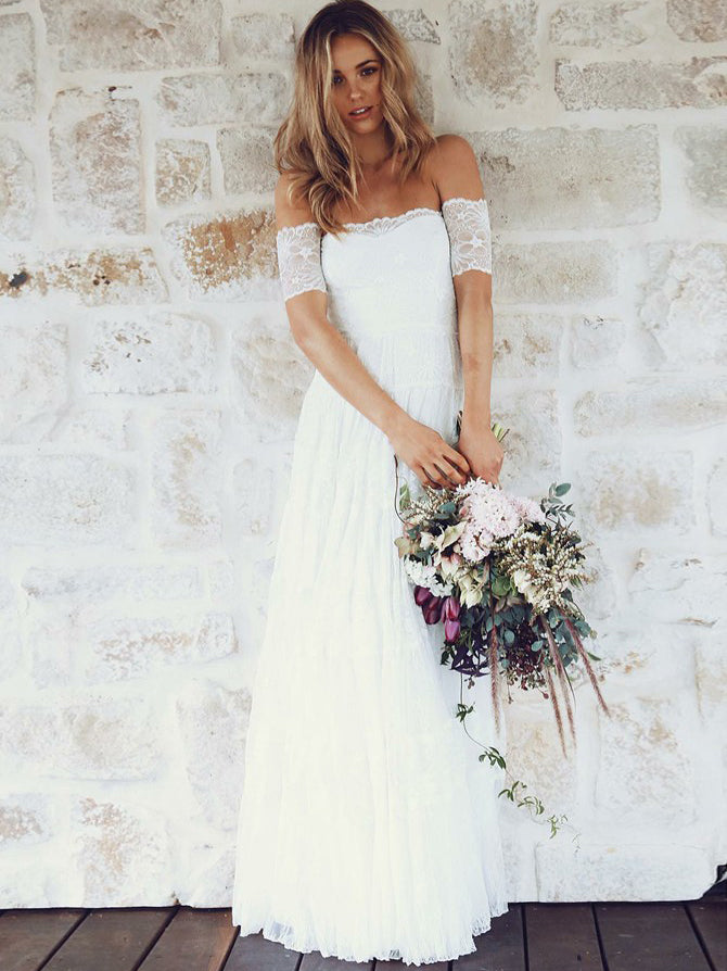 Off the Shoulder Boho Wedding Dresses A Line Simple Wedding Gowns with Open Back Affordable Bridal Dress