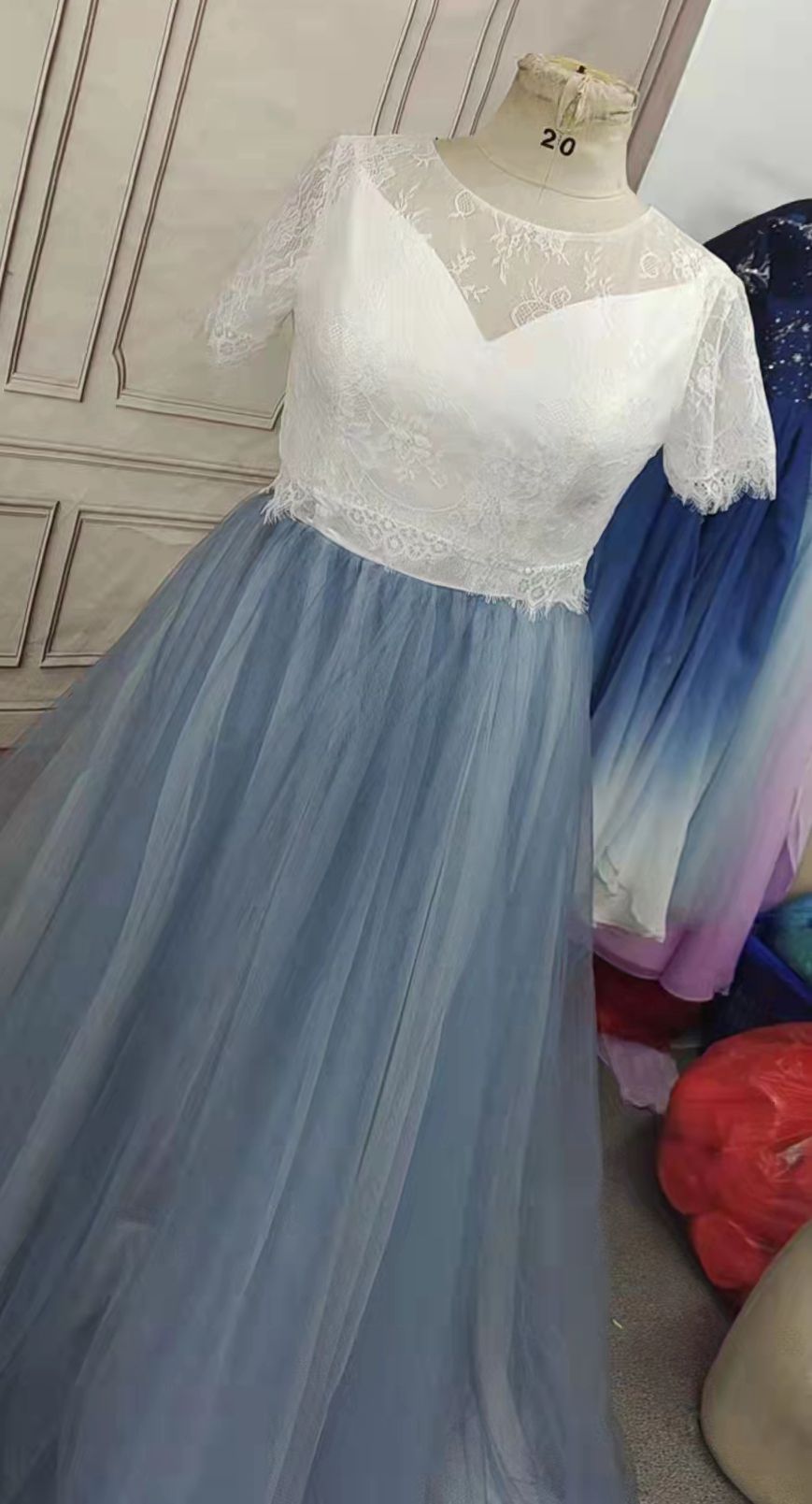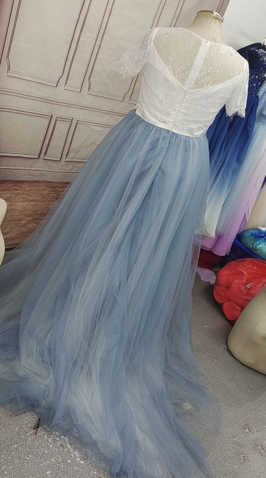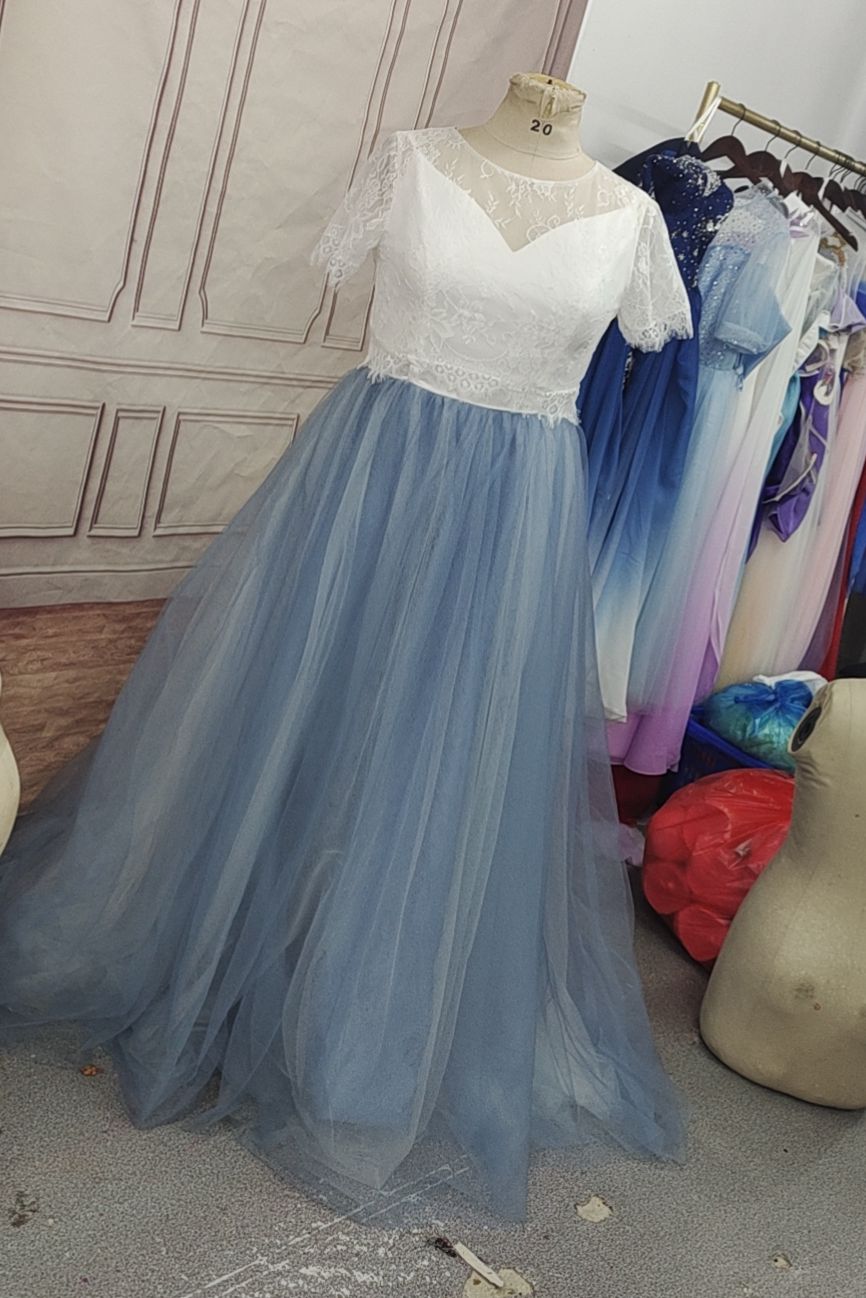 Real Photos Lace Top Dusty Blue Wedding Dresses A Line Tulle Bridal Dress with Sheer Back Beach Wedding Gowns