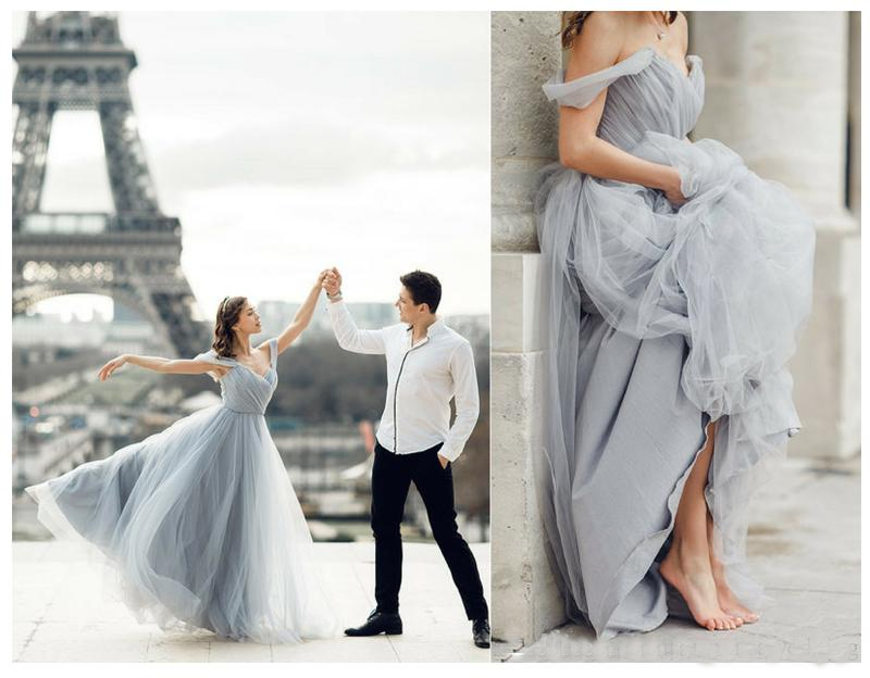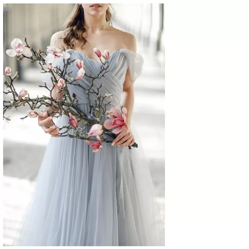 Off the Shoulder Dusty Blue Wedding Dresses Pleated Tulle Wedding Gowns Side Split Simple Bridal Dress