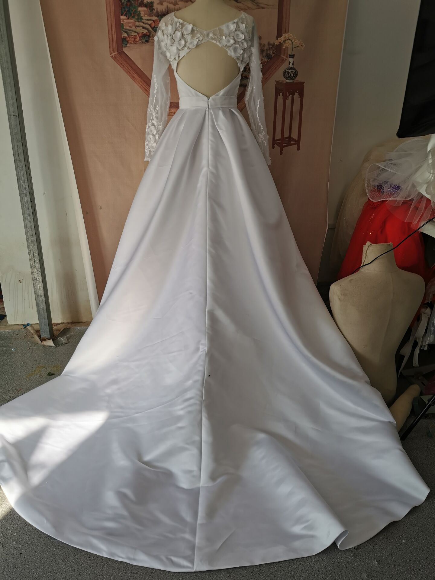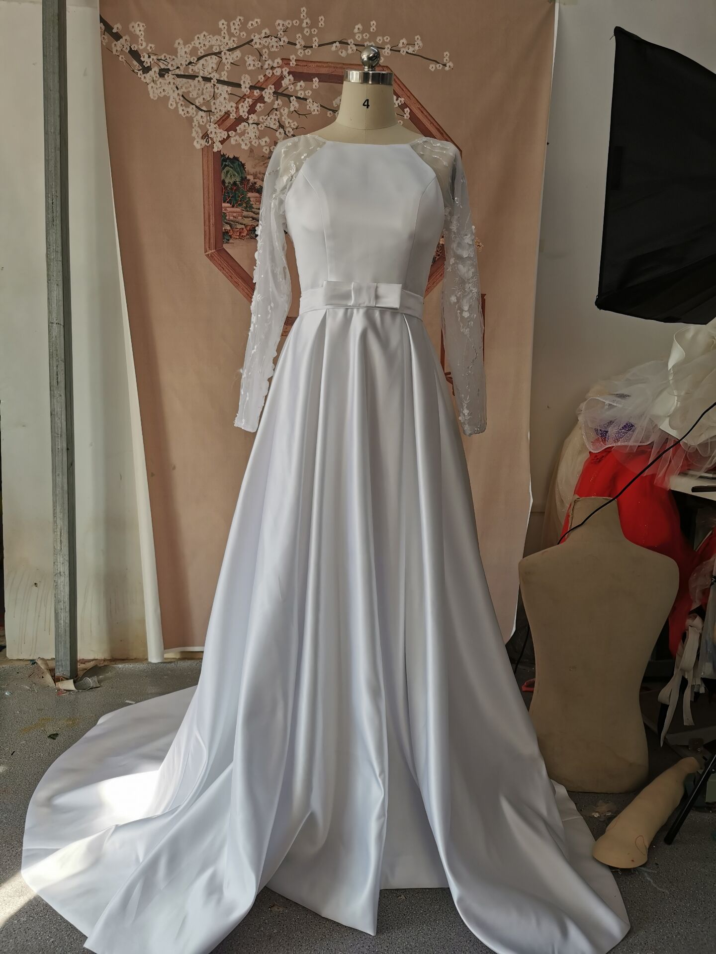 Real Photos Jewel Neck Long Sleeves Wedding Dresses A Line Satin Bridal Dress with Open Back Affordable Wedding Gowns