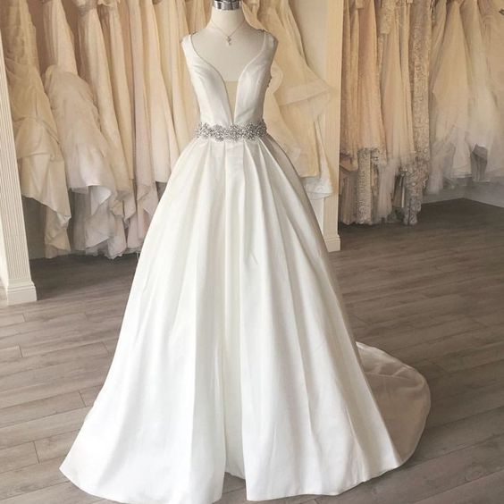 Sheer V-Neck Ball Gown Wedding Dresses Pleted Satin Wedding Gowns Beded Waist Modest Bridal Dress