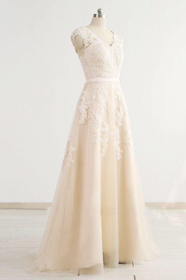 Decent V-Neck Champagne Wedding Dresses Lace Appliques Modest Wedding Gowns A Line Affordable Bridal Dress