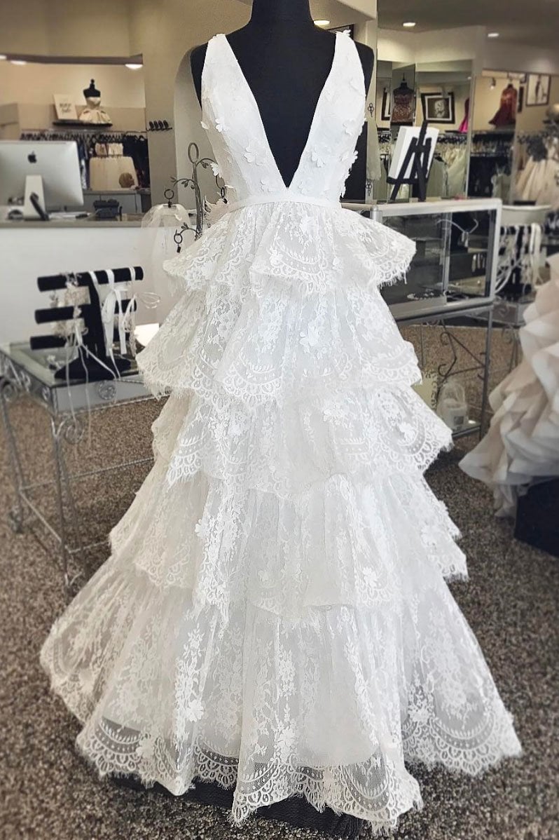 V-neck Satin and Lace Wedding Dresses with Tiered Skirts