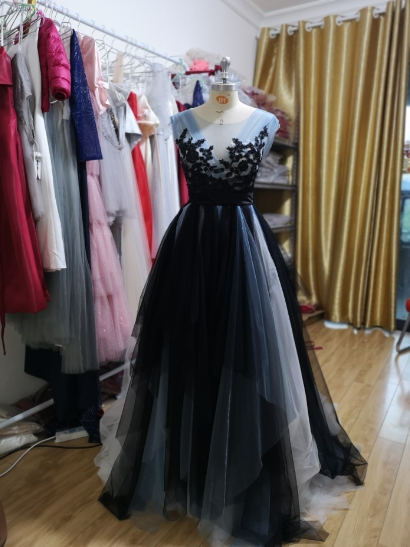 Real Photos Sheer Neck Black and Blue Ombre Wedding Dresses Lace Appliques Gothic Bridal Dress with Sweep Train Affordable Wedding Gowns