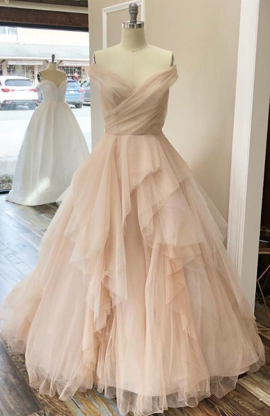 Off the Shoulder Pink Wedding Dresses Pleated Tulle Wedding Gowns with Lace Up Ruffle Dress for Bride