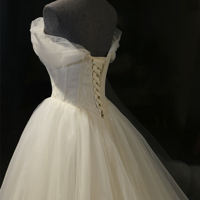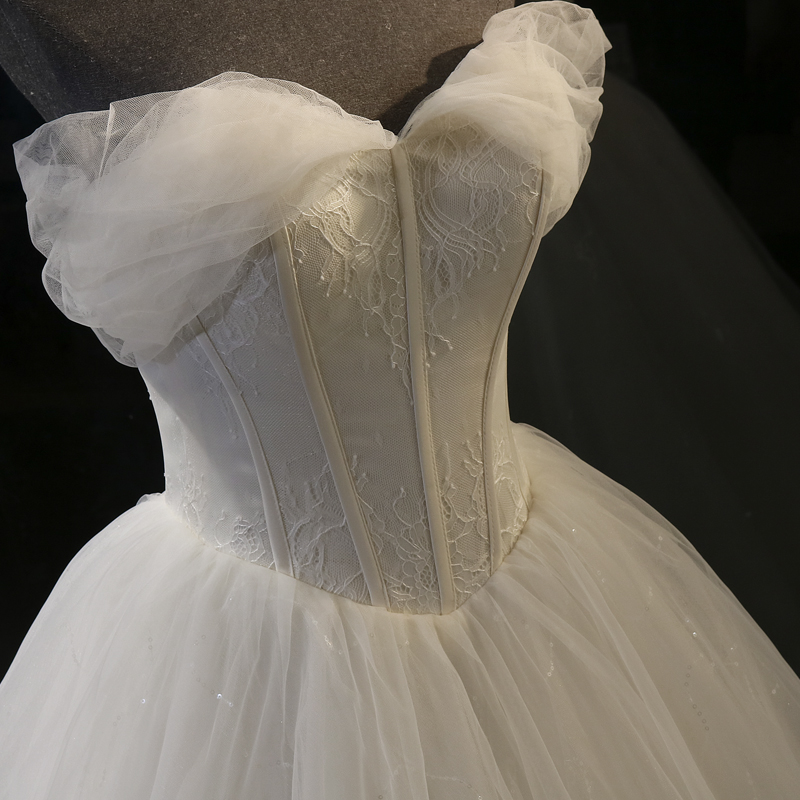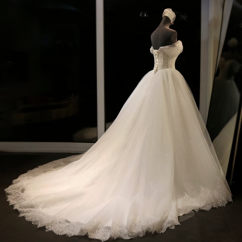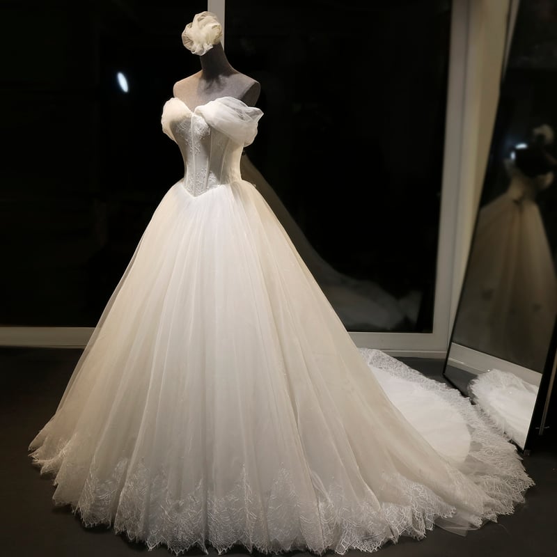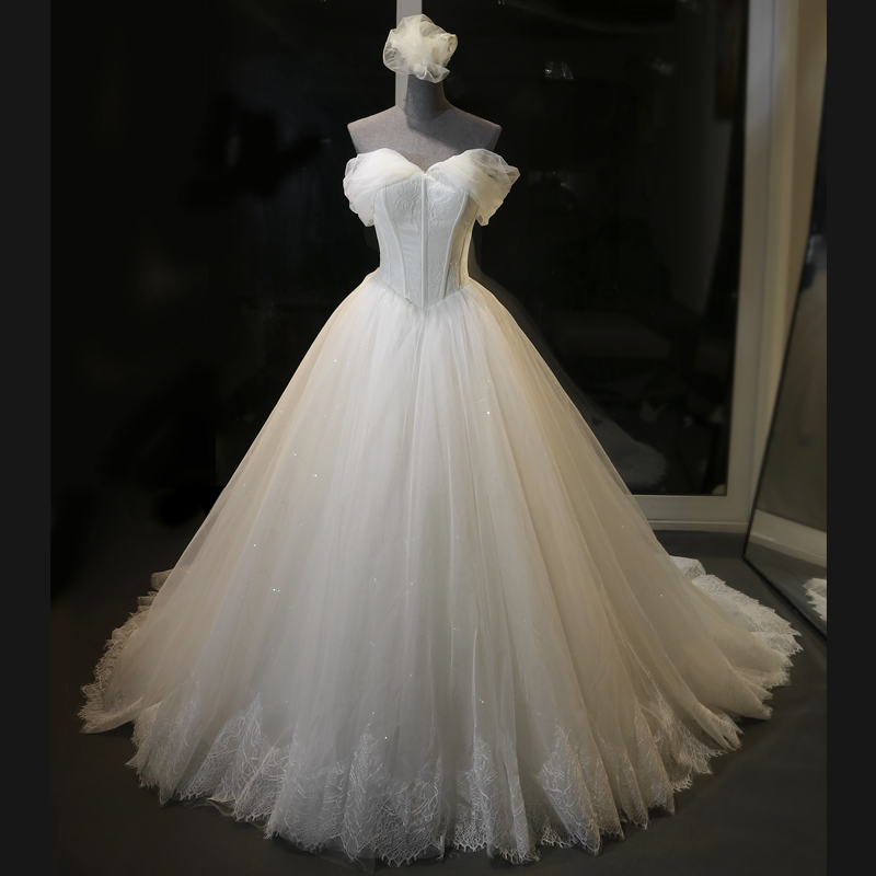 Off the Shoulder Ball Gown Wedding Dresses Lace Appliques Princess Wedding Gowns with Court Train White Bridal Dress