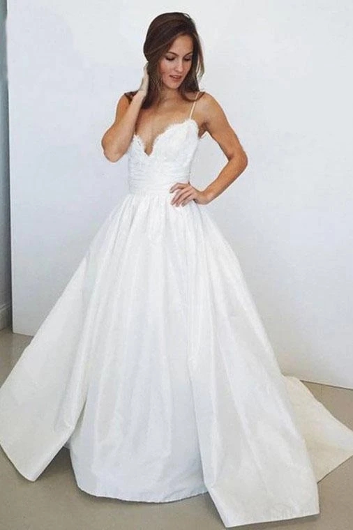 Spaghetti Straps Simple Wedding Dresses Pleated Satin Bridal Dress White Wedding Gowns