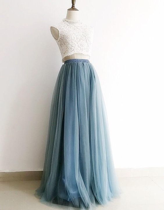 Round Neck Lace Top Boho Wedding Dresses A Line Dusty Blue Wedding Gowns 2 Pieces Bridal Dress