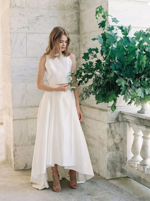Round Neck 2 Pieces Wedding Dresses High Low Satin Bridal Dress Sleeveless Simple Wedding Gowns