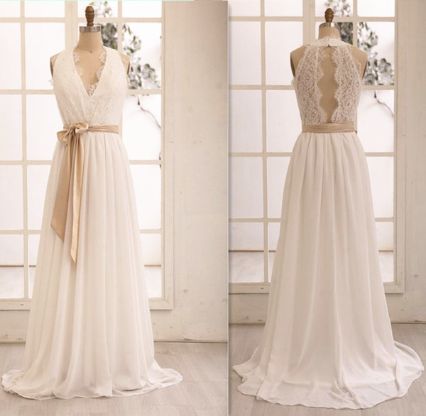 Elegant V-Neck Chiffon Wedding Dresses A Line Ivory Bridal Dress with Lace Back Pleated Boho Wedding Gowns