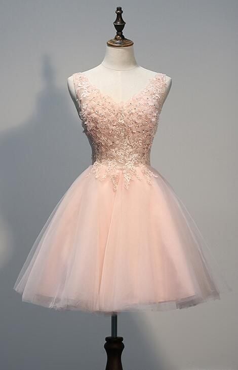 Chic V-Neck Light Pink Homecoming Dresses Lace Appliques Short Evening Gowns with Zipper Party Dress