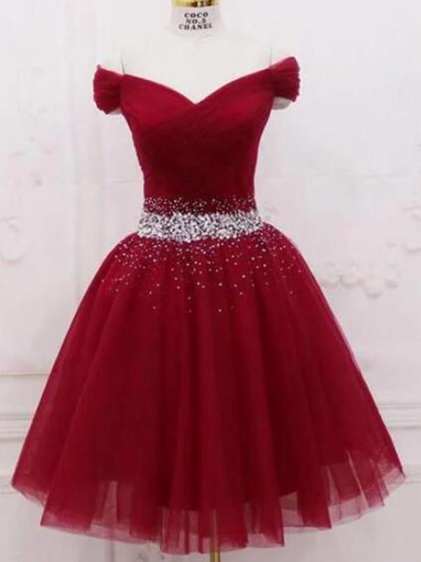Off the Shoulder Burgundy Homecoming Dresses Beaded Tulle Party Dress Knee Length Short Evening Gowns